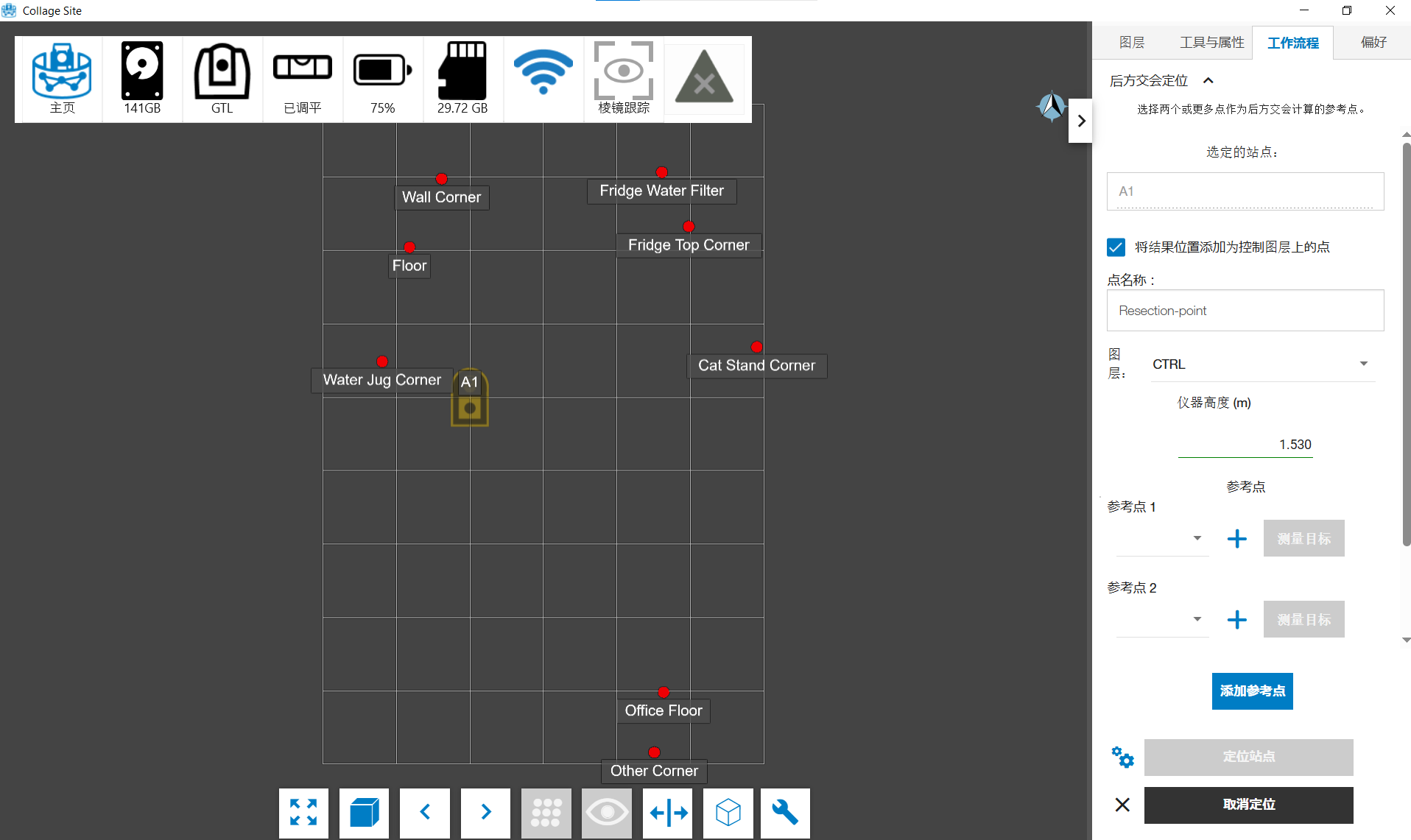 输入要使用的点后,为每个参考点点击 ** 测量目标** 按钮,一次一个。您将进入目标测量界面。有关完成观测的进一步说明,请参阅 目标测量一文。