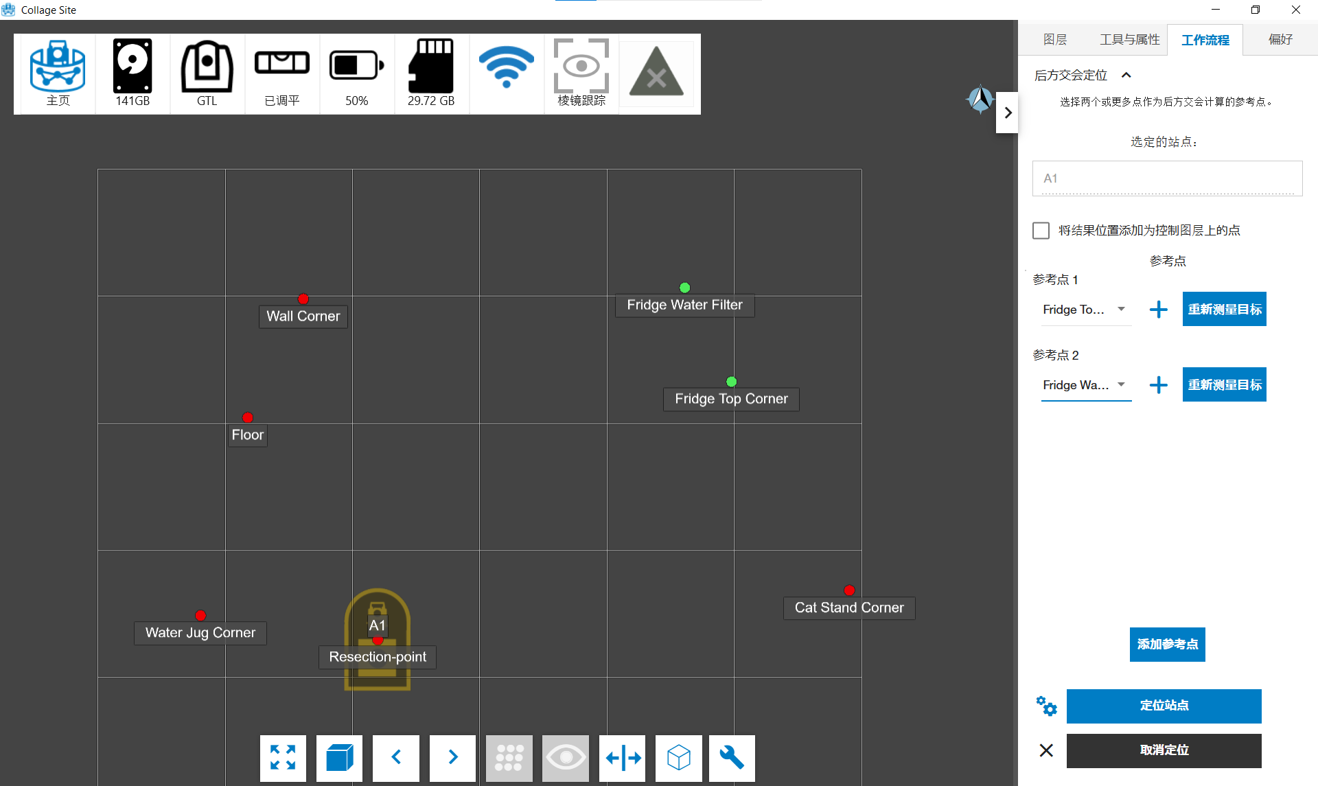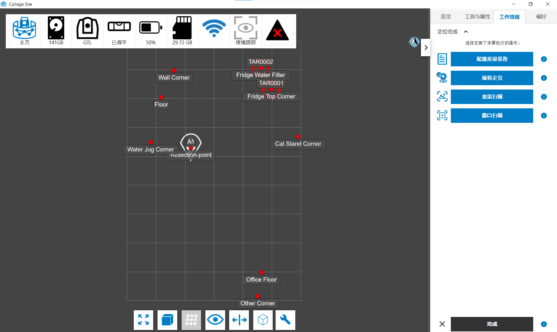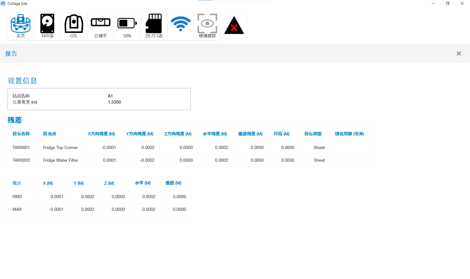测量完所有参考点的目标后,点击定位测站按钮运行定位过程。处理完成后,将可查看 ** 注册质量报告*。