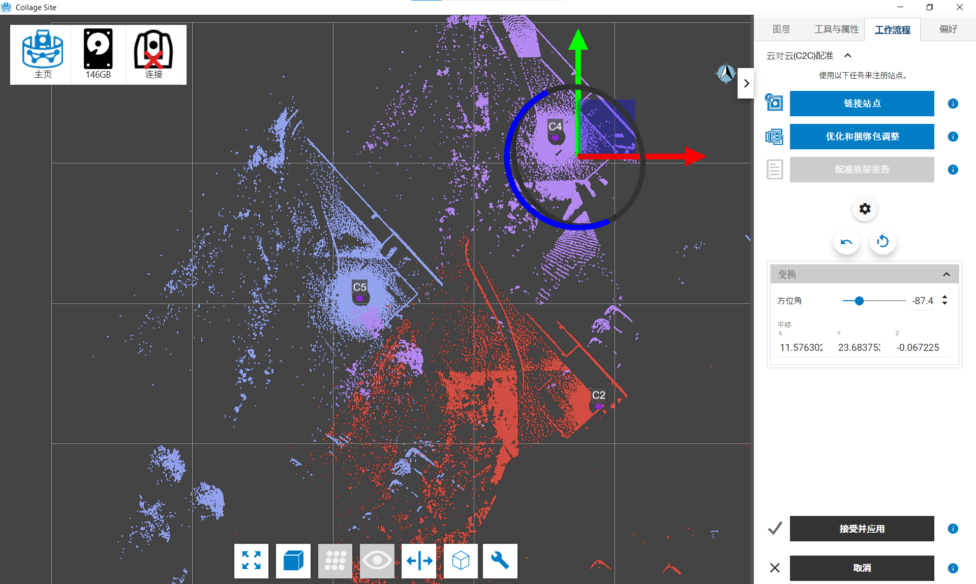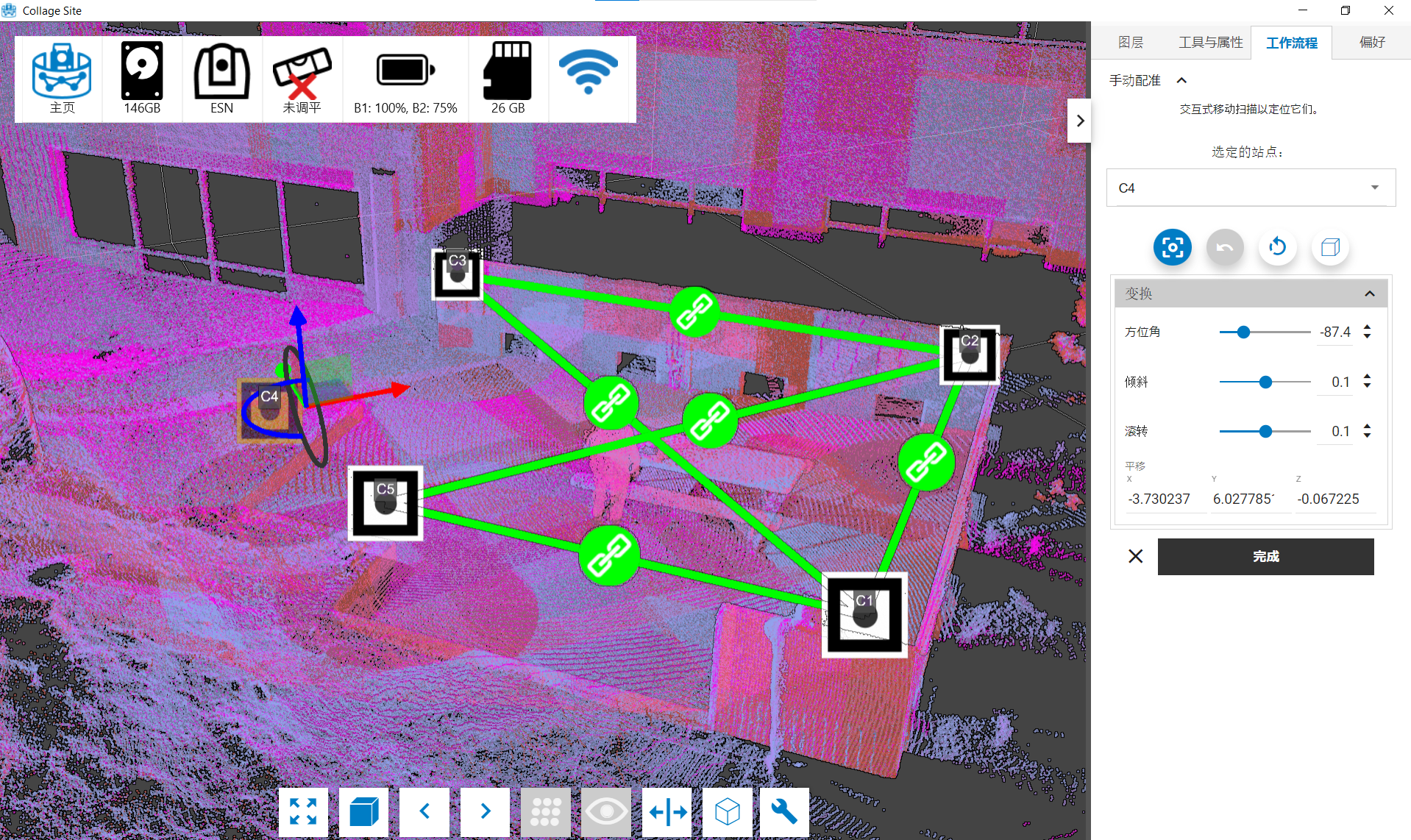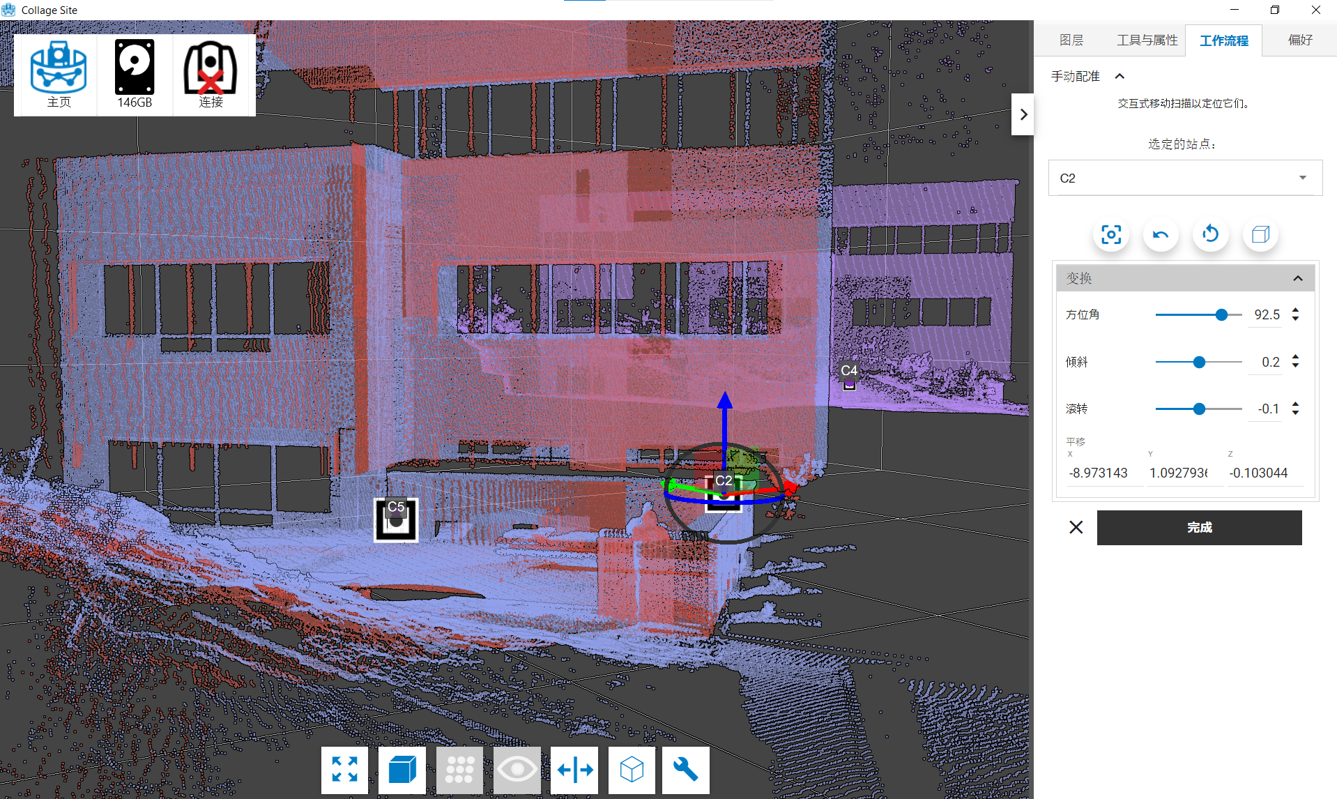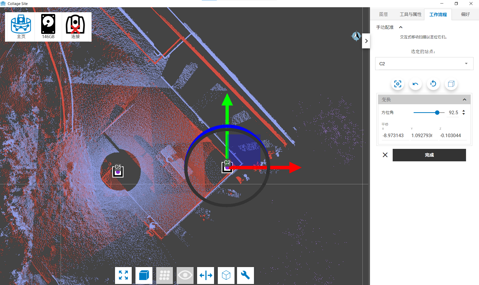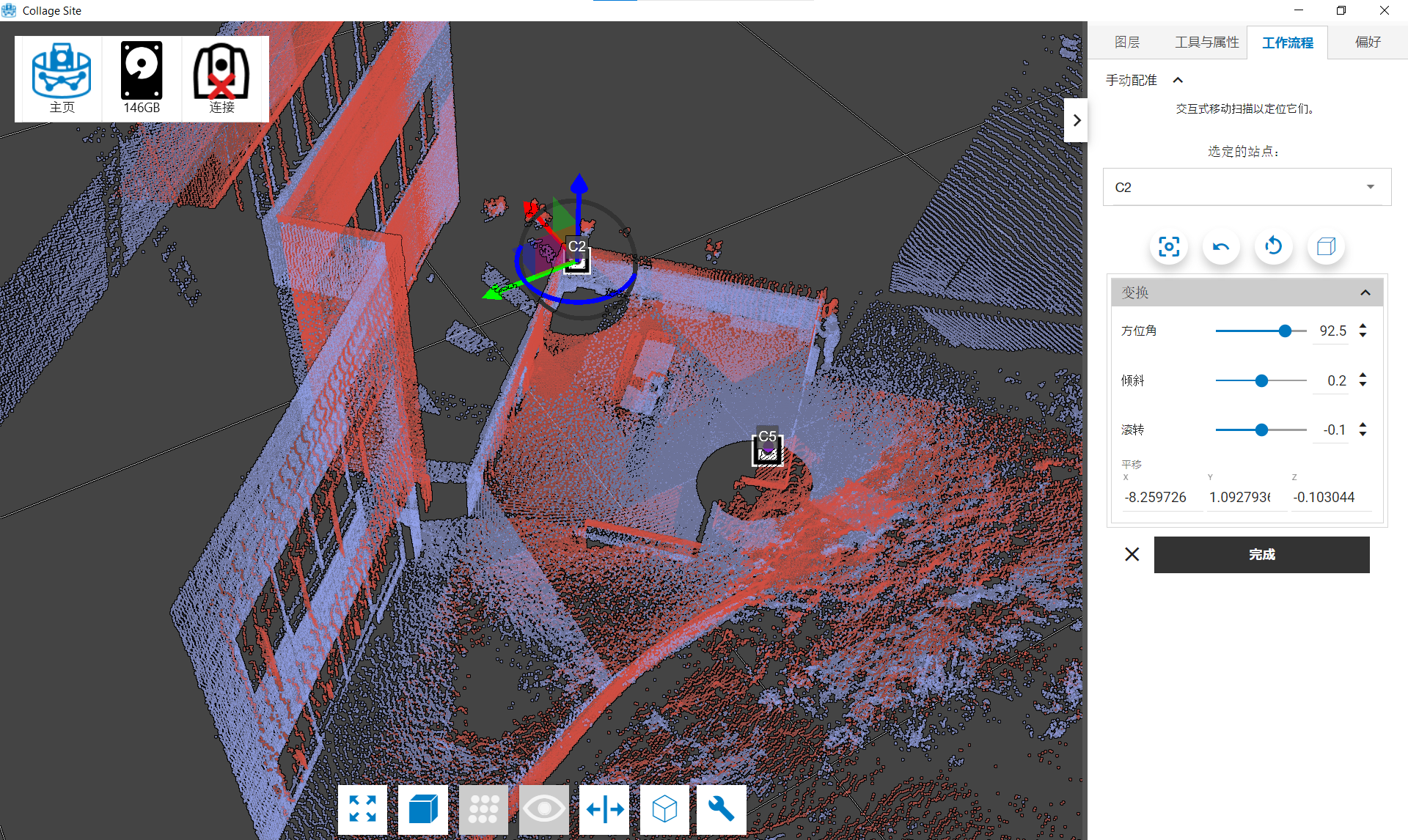 一旦您对台站的大致对齐情况感到满意,就可以点击工作流程菜单中的完成按钮,保存您对项目中的台站、位置和方向应用的转换。