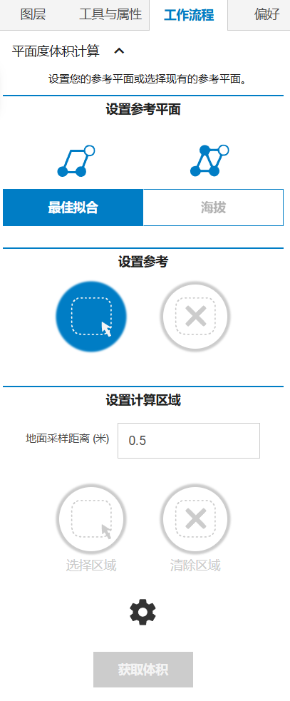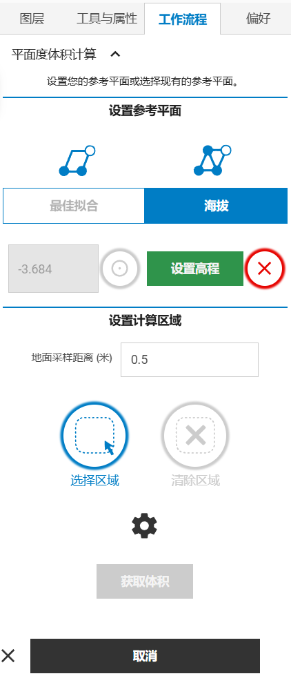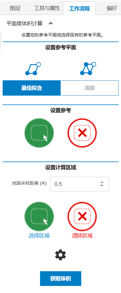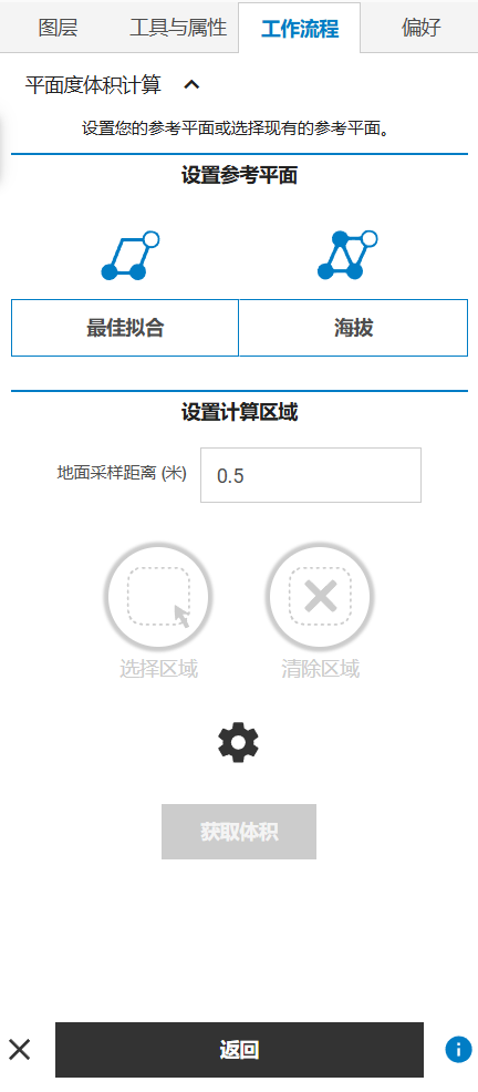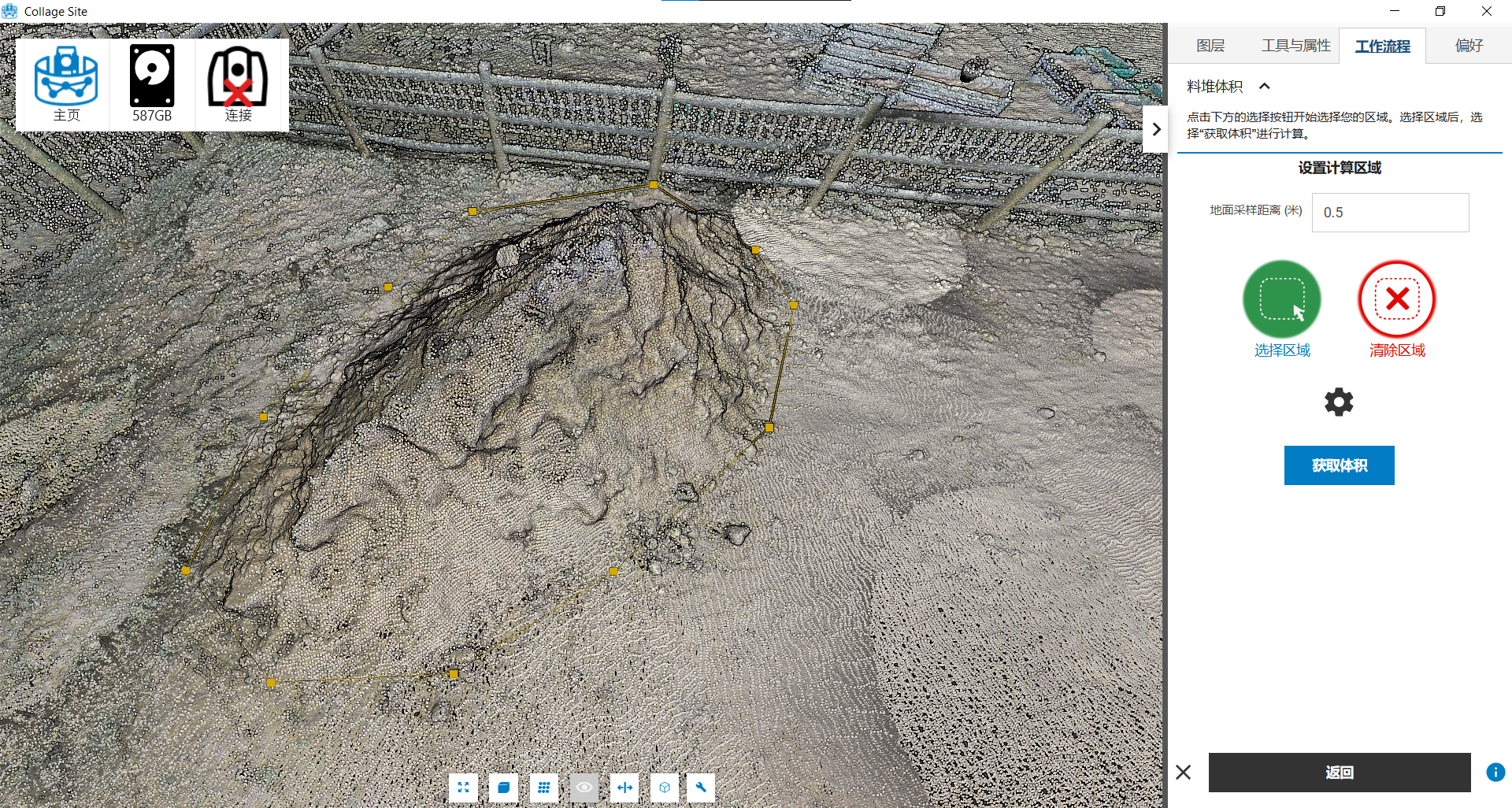 开始时,您必须首先点击选择区域按钮。启动后,您需要点击点云中至少 3 个不同的点。请注意,如果边界线交叉,计算将失败。确定好边界后,点击获取体积按钮开始处理。