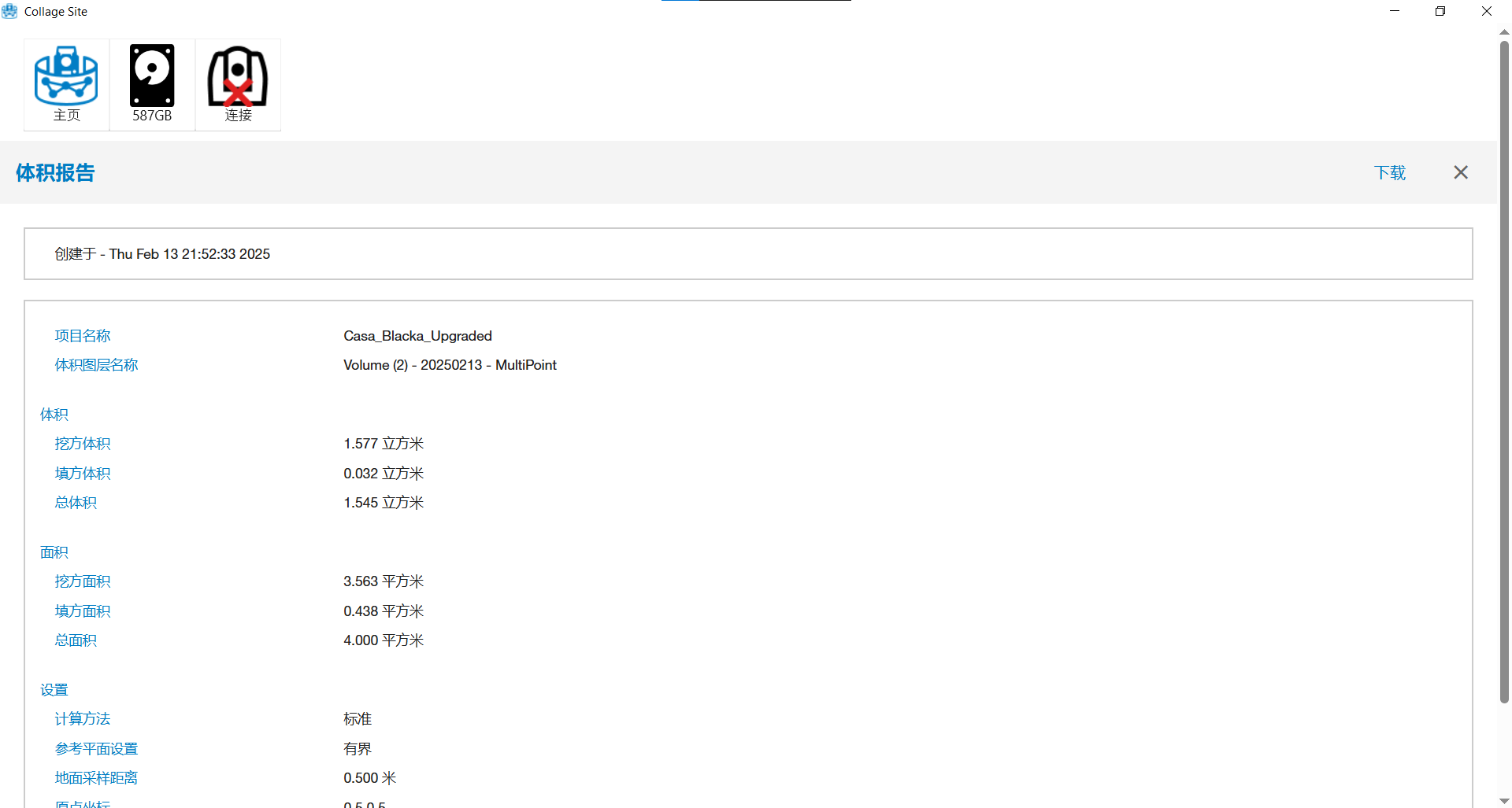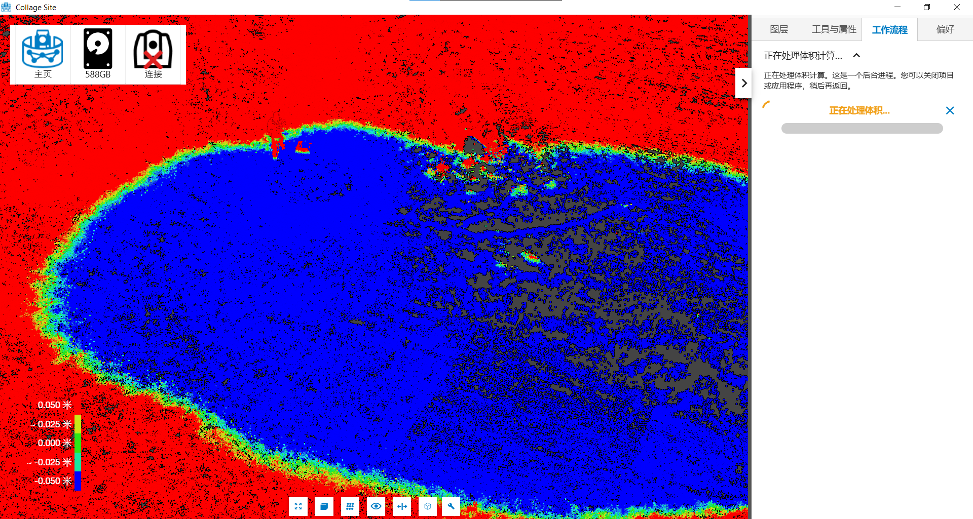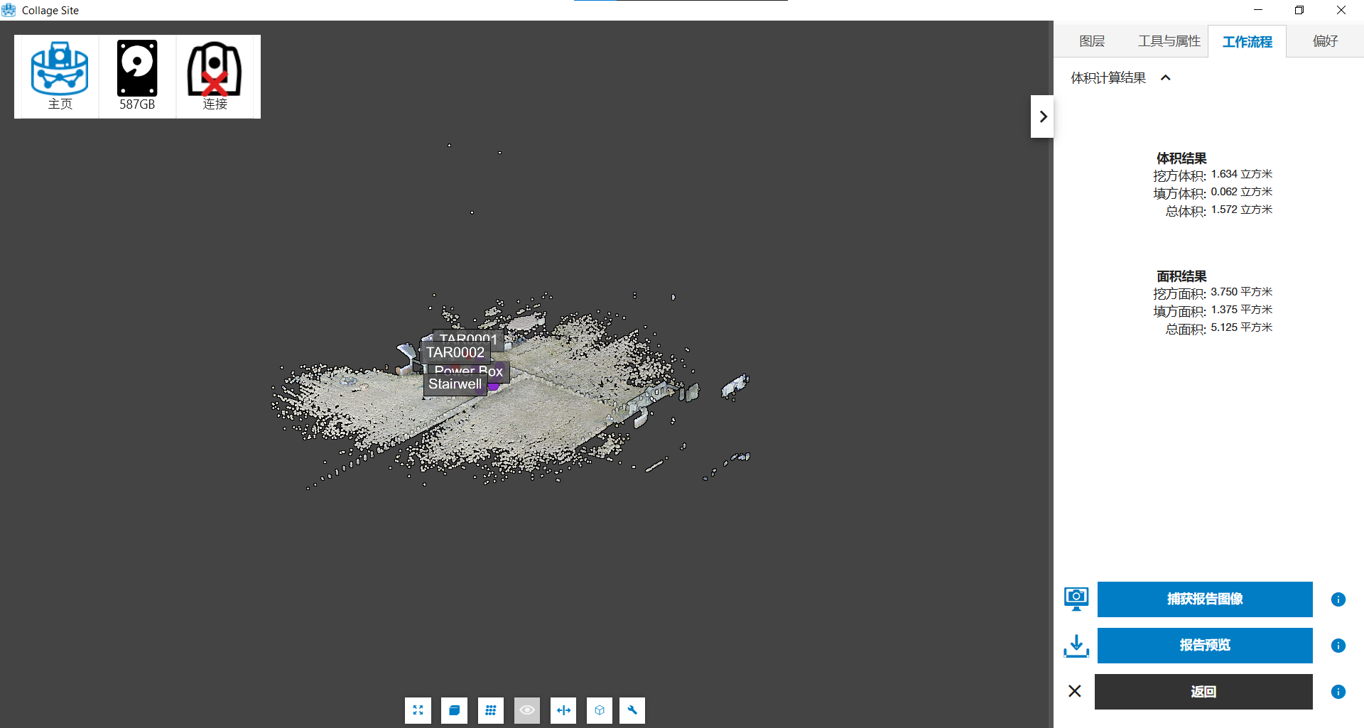 开始时,您必须首先点击选择区域按钮。启动后,您需要点击点云中至少 3 个不同的点。请注意,如果边界线交叉,计算将失败。确定好边界后,点击获取体积按钮开始处理。