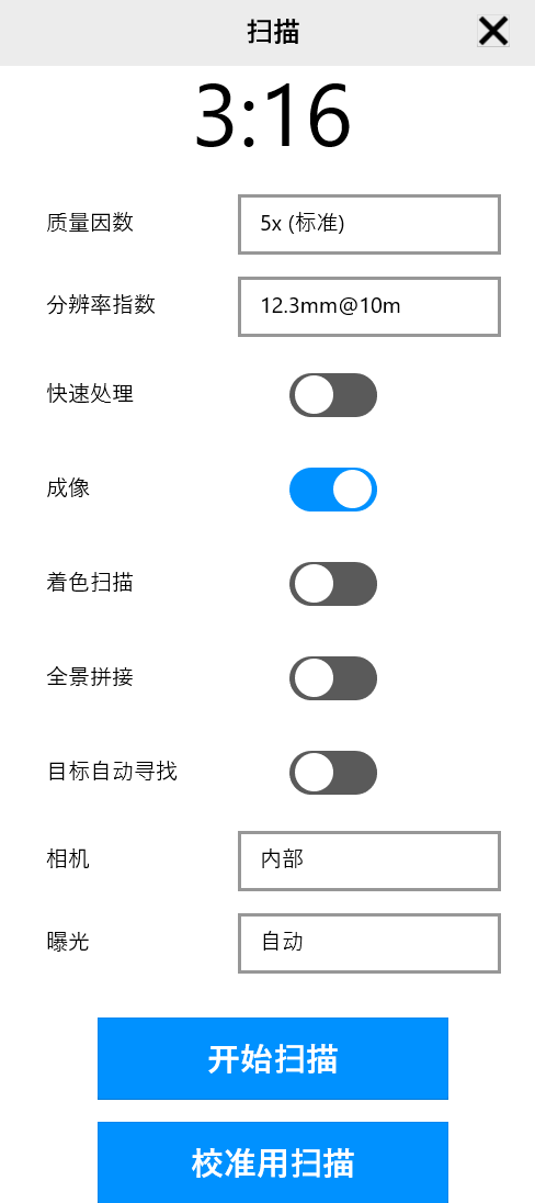 校准扫描选项仅在连接到 CR-P1 仪器时可用,用于帮助校准外部全景相机与点云数据。请参阅仪器用户手册以获取更多详细信息。 若希望扫描仪在全穹顶扫描过程中拍摄周围环境的摄影图像,请将成像开关设置为ON。为节省现场时间,建议同时关闭全景拼接开关。开启此开关后,扫描仪在现场拍摄的全景照片将被完全处理。您可在后续处理扫描数据时重新启用此选项以查看照片。