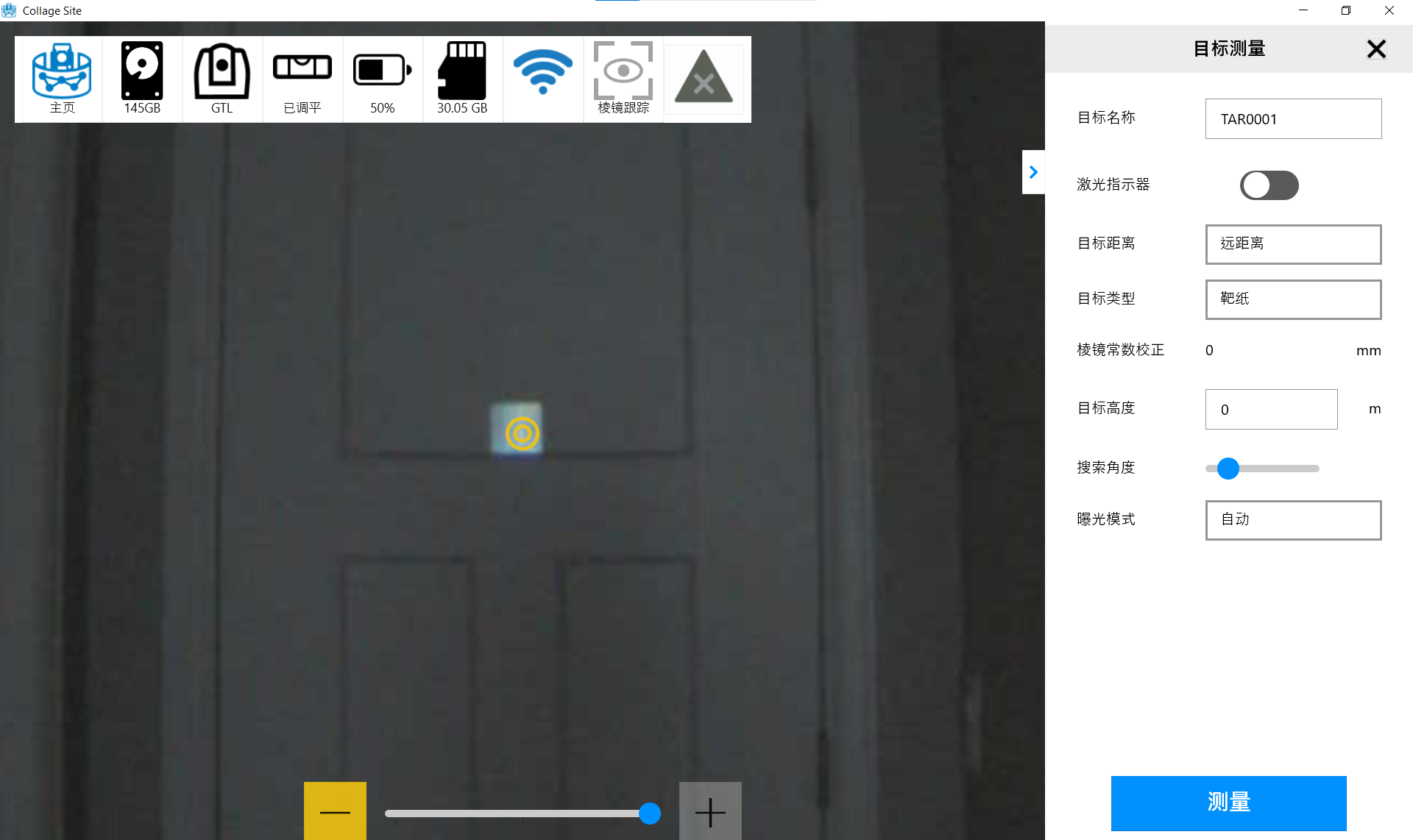 根据需要使用 +/- 按钮调整缩放级别,以看清目标。然后,通过点击摄像机图像上的目标来调整瞄准器位置,使其接近目标。