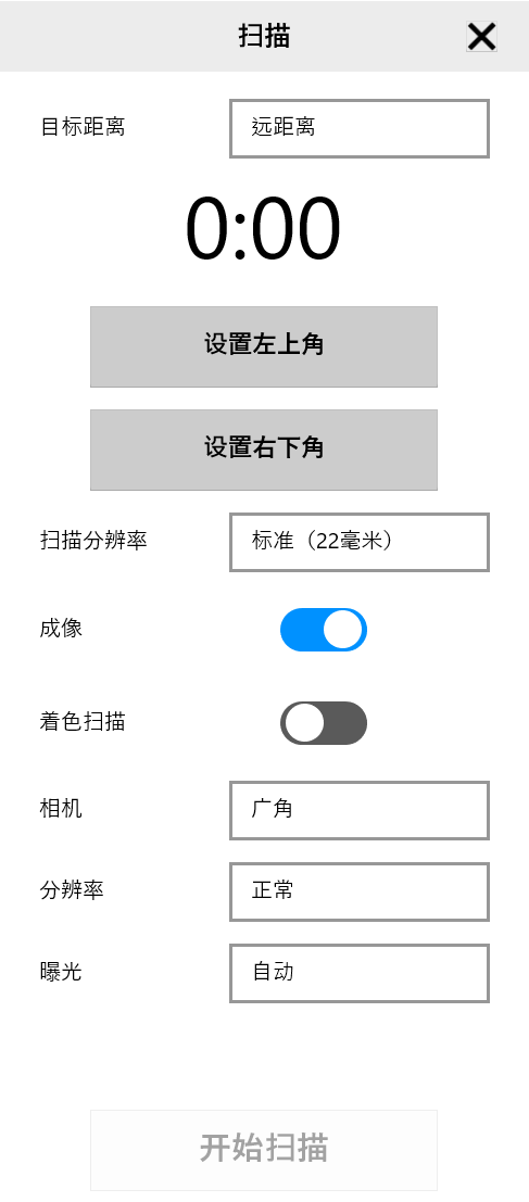进入工作流程后,只需用手指或触控笔按下要选择扫描的位置。在继续按压的同时,拖动手指在所需扫描区域周围创建一个方框。在拖动手指时,您会看到一个红色的方框在动态调整。对选择区域满意后,松开按键。设置左上角 “和 ”设置右下角 “按钮将变为绿色,其文字也将变为 ”清除左上角 “和 ”清除右下角"。如果您对选择满意,请继续调整其他扫描细节,以满足您的任务参数要求。