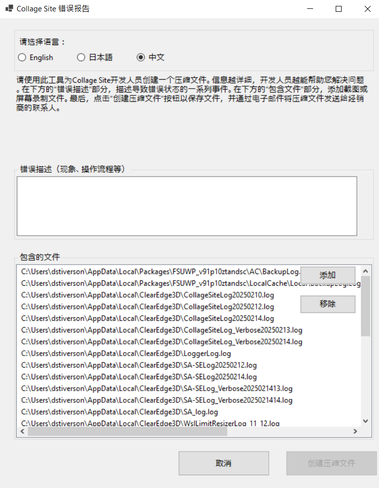 如果您在使用 Collage Site 时遇到任何问题,请配合我们的支持团队提供日志文件。分析日志文件可能有助于支持人员和开发人员比没有日志更快地解决软件问题。