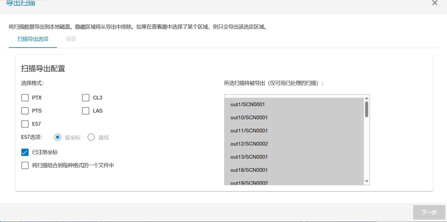 允许您将 Collage Site 扫描数据导出为支持的格式,并将当前注册和本地化信息写入扫描文件中,以便在下游应用程序中使用。如果格式支持,则可以将扫描内容分组到单个文件中或单独保存。