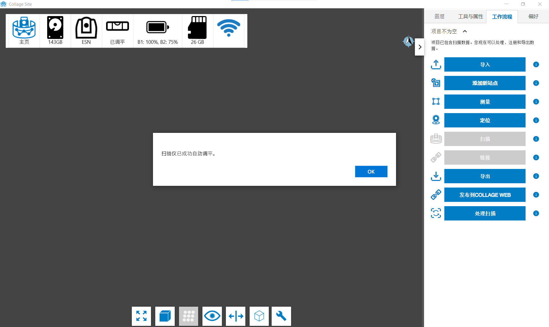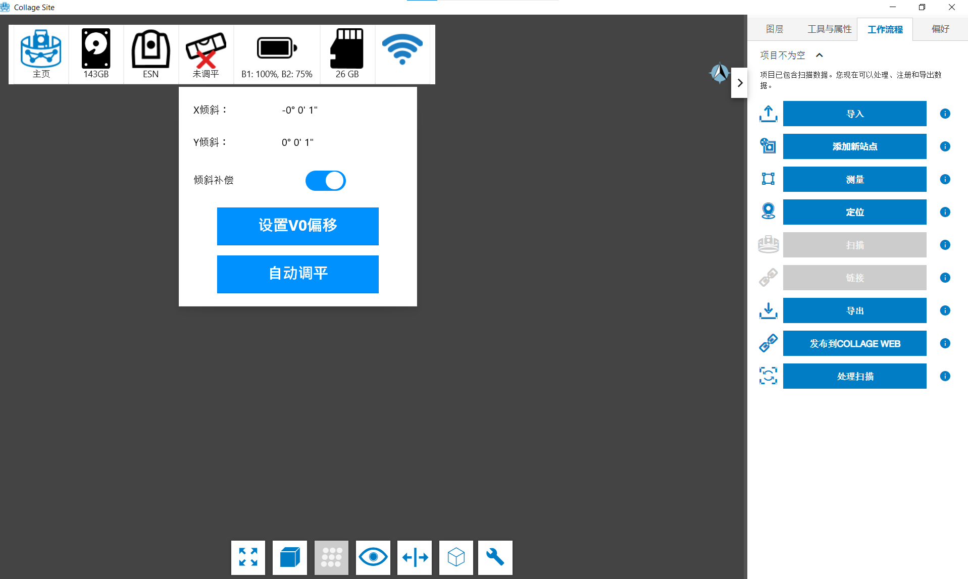 自动调平功能可自动调平ESN-100扫描仪。要使用该功能,必须启用倾斜功能。首先点击屏幕顶部的倾斜状态按钮。