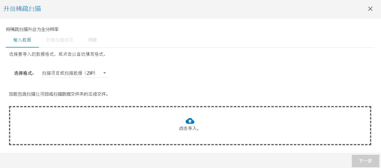 从主工作流选项卡转到 导入工作流 选择器面板,然后点击 升级稀疏扫描 按钮。将打开以下对话框: