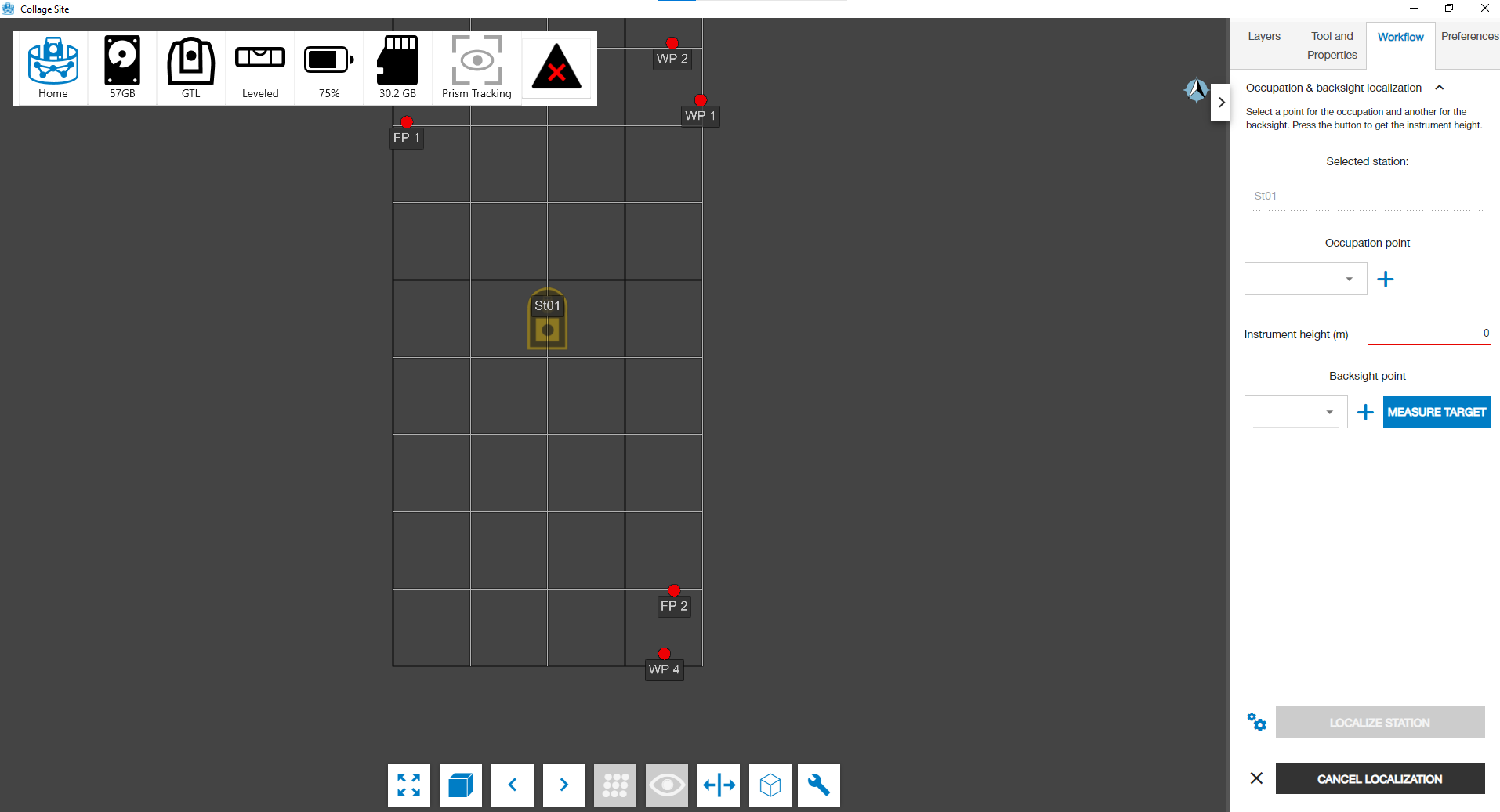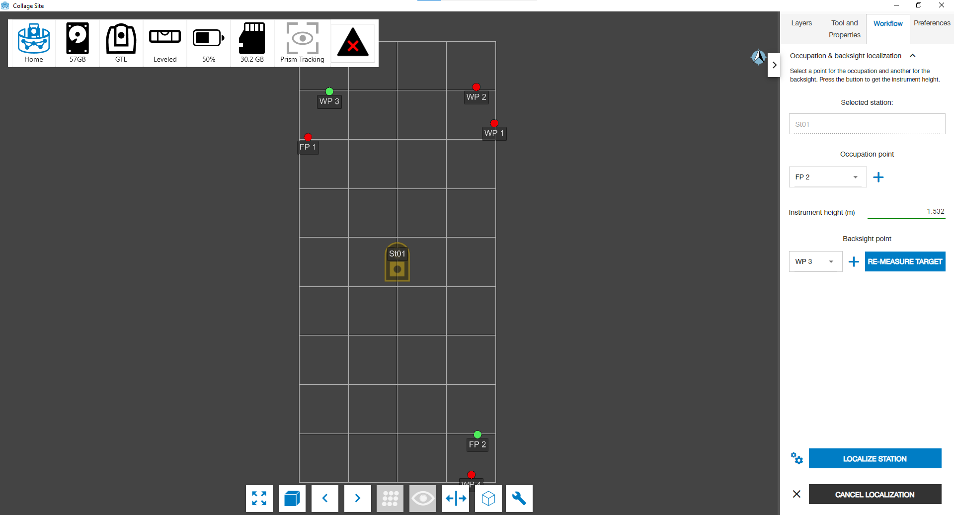 After having created a new station, choose the Localize option from the right side of the screen. Then, choose the Occupy & Backsight option.