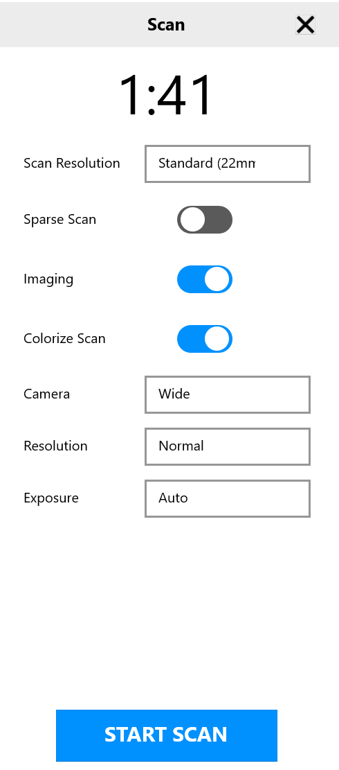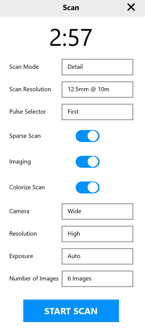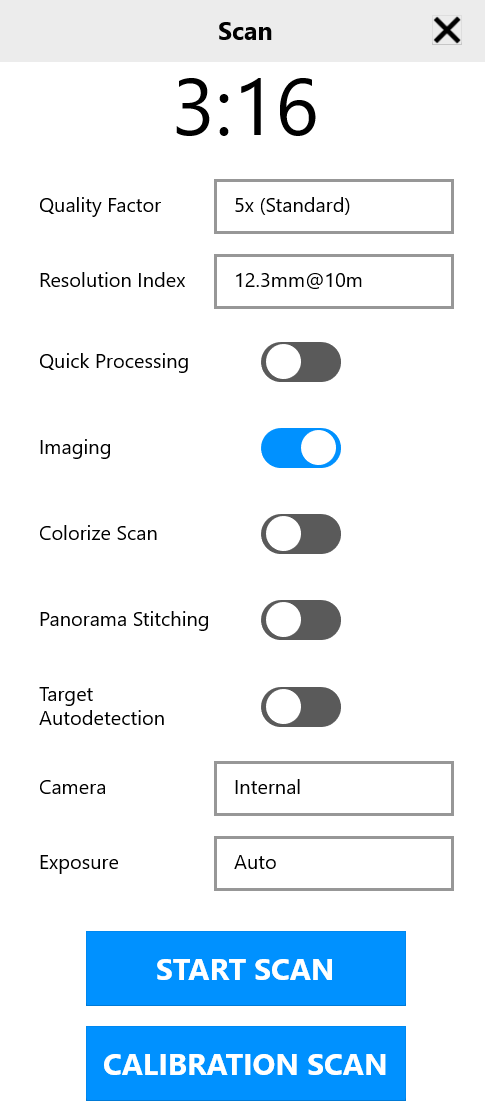 Turn the Imaging toggle ON if you would like for your scanner to take photographic images of your surroundings as apart of the full dome scan. You can save time in the field by also turning OFF the Panorama Stitching toggle. Leaving this toggle ON will fully process the panorama photographs that the scanner takes while you are in field. You can always reprocess the scans with this option enabled later on to view the photographs as well.