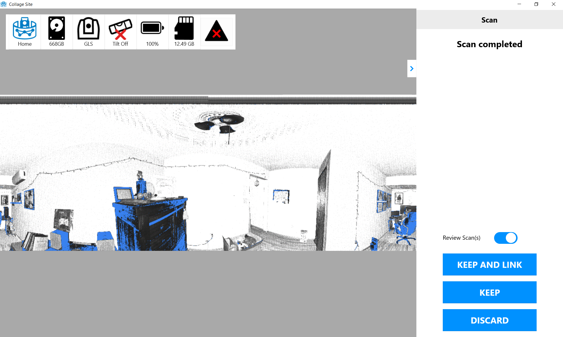 - The Keep and Link button will initiate the transfer of the scan data from the instrument to the tablet. Additionally, Collage Site will automatically create a link between the current station and the previous station and register them using the automatic Cloud-to-Cloud registration option when Keep and Link is selected.