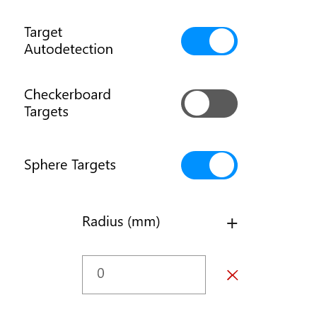 Finally, you will also notice the Target Autodetection toggle when using the CR-P1 device. Turning this toggle ON will automatically pick up and create target layers in Collage Site for any checkerboard or spherical targets that are seen in the scan that you just took. Note that for using Spherical targets, you will need to input specifics about the radius of each sphere target being used.