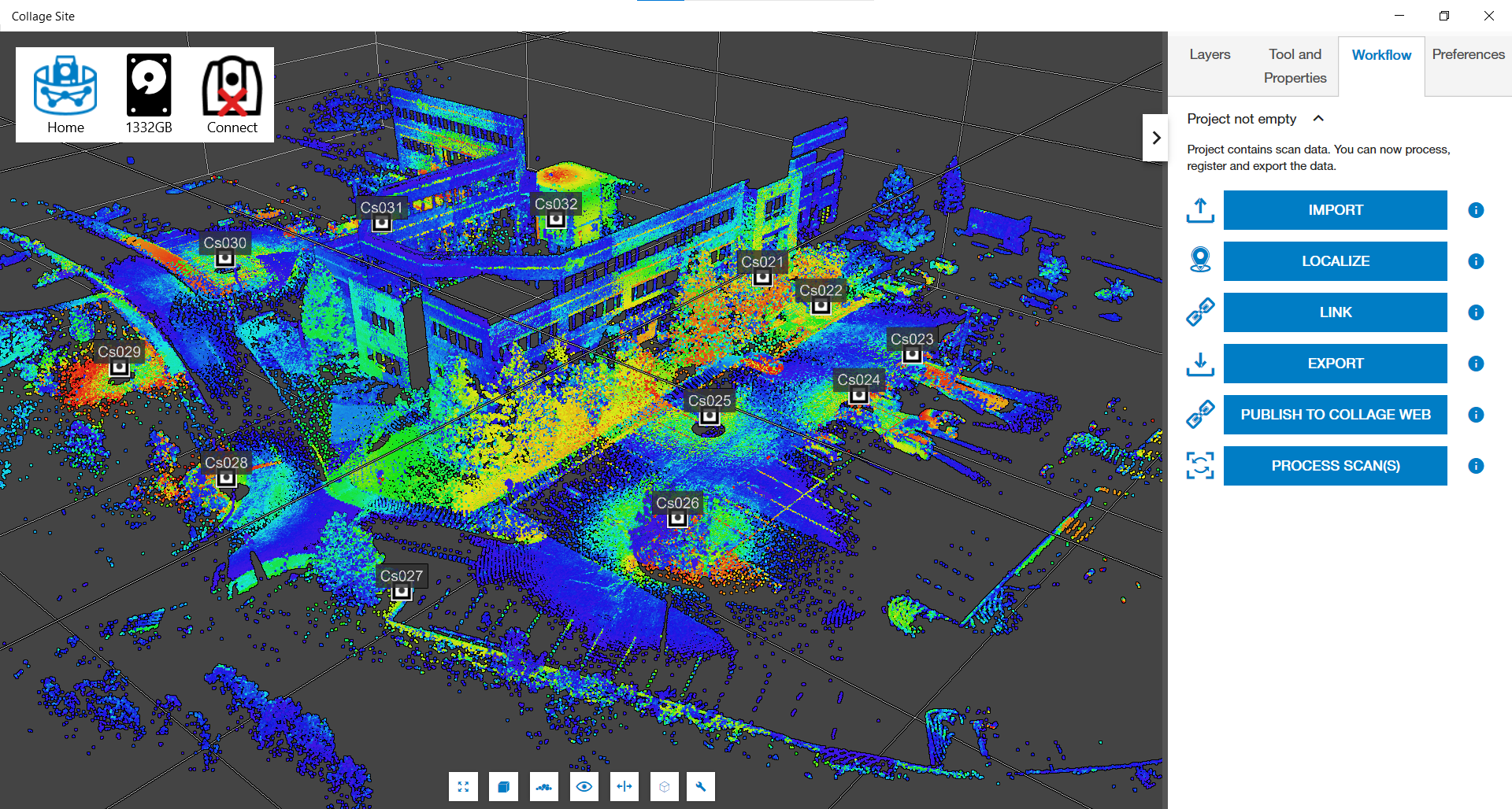 Collage Site can export scan data, entire projects, or publish individual projects to Collage Web. To Publish to Collage Web, use the Publish to Collage Web button in the top-level workflow panel. The additional export options are in the Export Workflow selector panel.