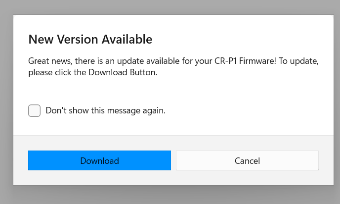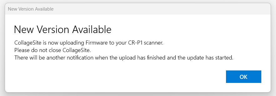 Once the download is completed, connect to your CR-P1 scanner again and you should see the following message: