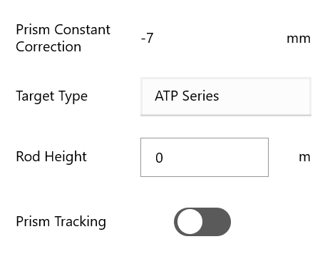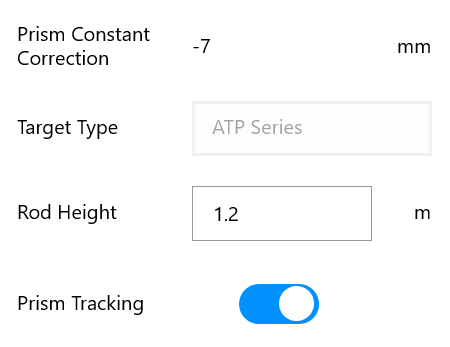 Then set the prism type and rod height with the menu that appears underneath the Prism Tracking button.