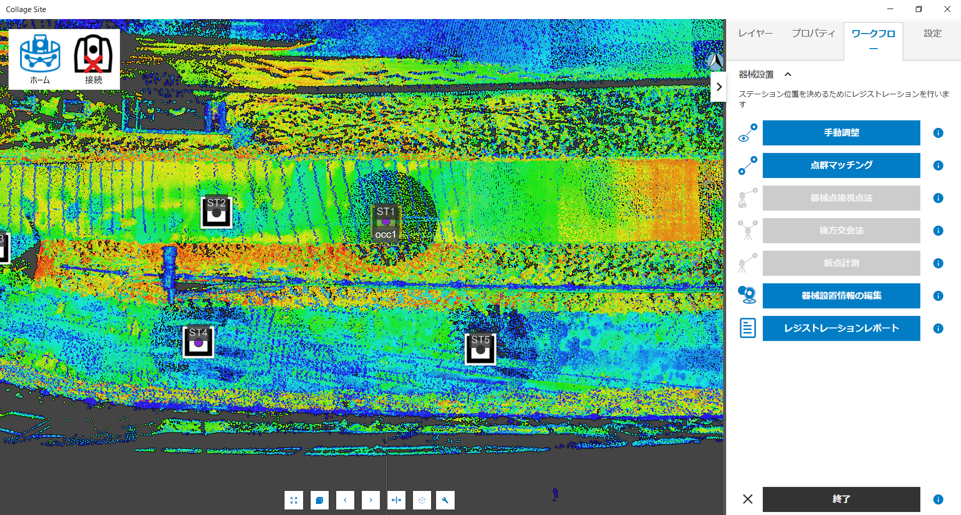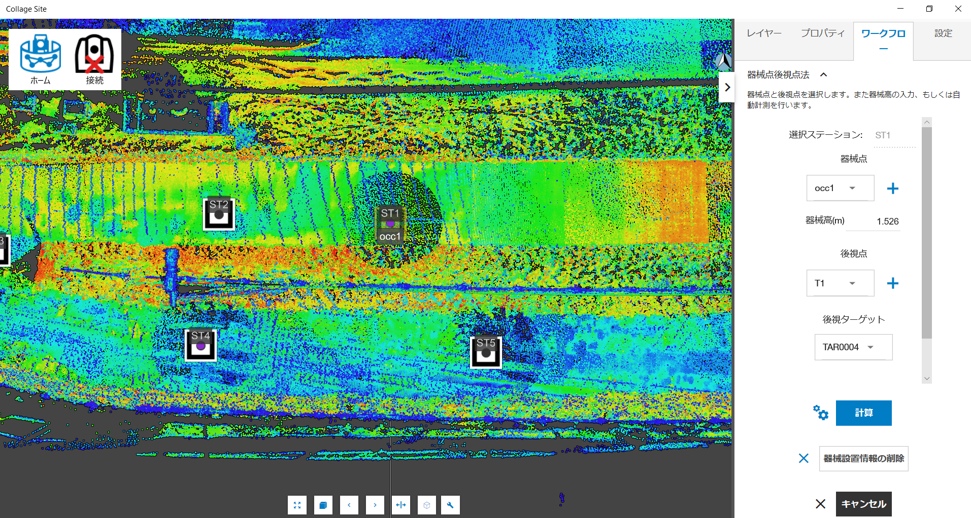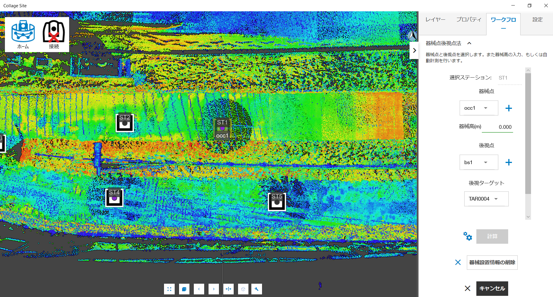 まず、既知点を用いて器械設置されたステーションを選択します。次に、右側のワークフローパネルより、器械設置、器械設置情報の編集を順に選択します。