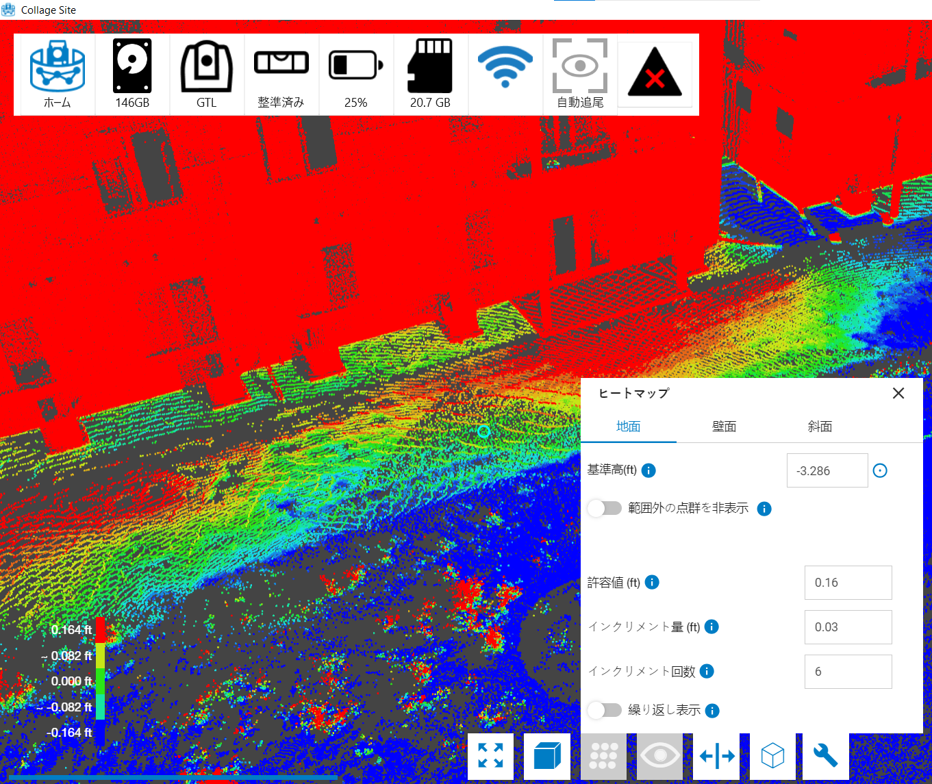次に、点群内の地上の点をタップします。テキストフィールドで手動で標高を設定することもできます。標高が設定されると、ヒートマップが表示されます。