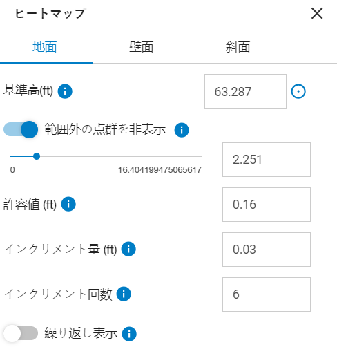 この設定を有効にすると、数値を入力するテキストフィールドとスライダーが表示されます。この機能は、ヒートマップビューでのみ表示されます。スライダーまたはテキストフィールドを使用してパラメータを希望の距離に設定すると、指定した標高(またはポイント)より上と下にある点群がら非表示になります。