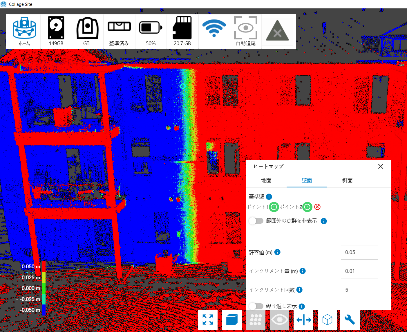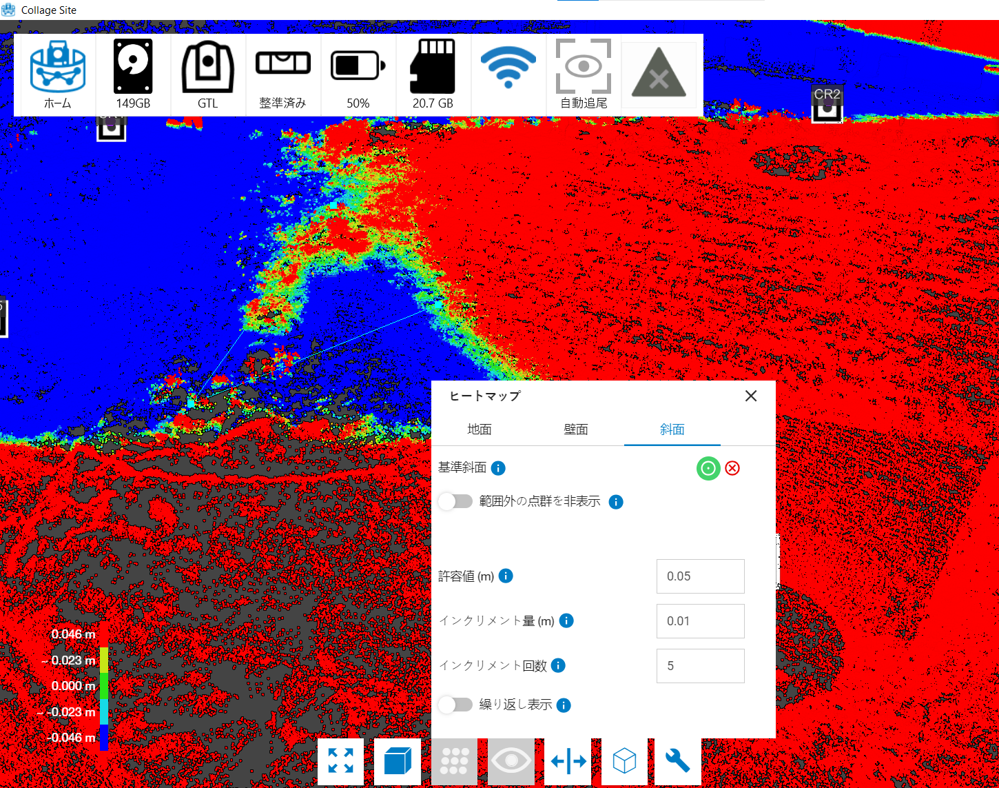 このテキストフィールドは、基準標高からヒートマップを作製する距離の上下の範囲を調整します。この範囲の上限値を超えた点群は赤、下限を超えた点群は青で表示されます。