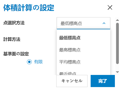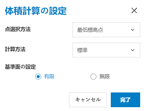 この設定は、グリッド内の最も低い標高点を使用します。植生などの下の体積を計算する場合に最適です。