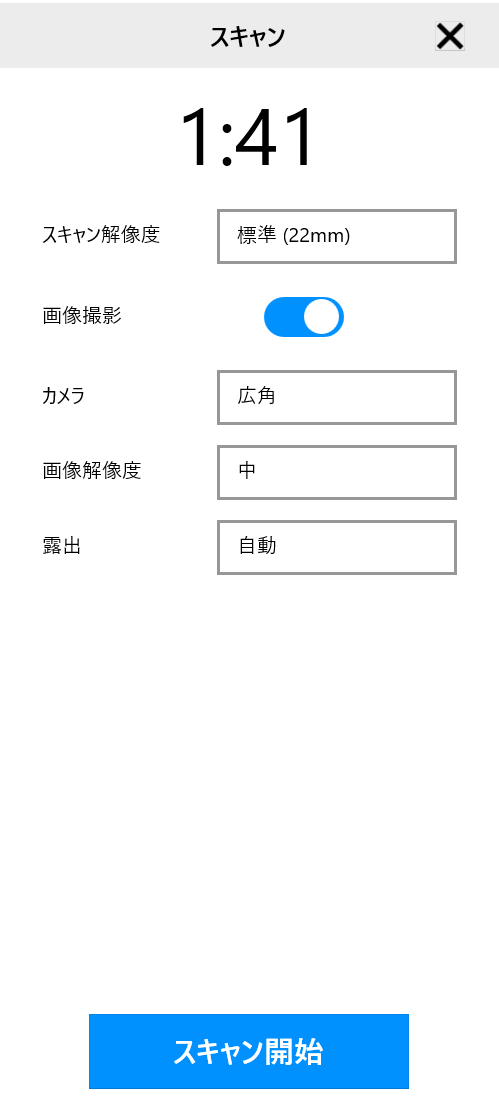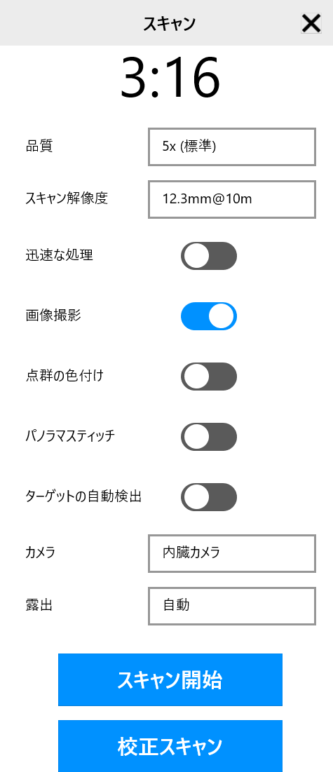 キャリブレーションスキャン オプションは、CR-P1 機器に接続している場合のみ利用可能で、外部パノラマカメラを点群データと校正するために使用されます。詳細については、機器のユーザーガイドを参照してください。 スキャナーがフルドームスキャンの一部として周囲の写真を撮影するようにしたい場合は、イメージングトグルをONに設定してください。パノラマスティッチングトグルをOFFに設定すると、現場での作業時間を短縮できます。このトグルをONに設定したままにすると、スキャナーが現場で撮影したパノラマ写真が完全に処理されます。後でこのオプションを有効にしてスキャンを再処理すれば、写真も表示できます。
