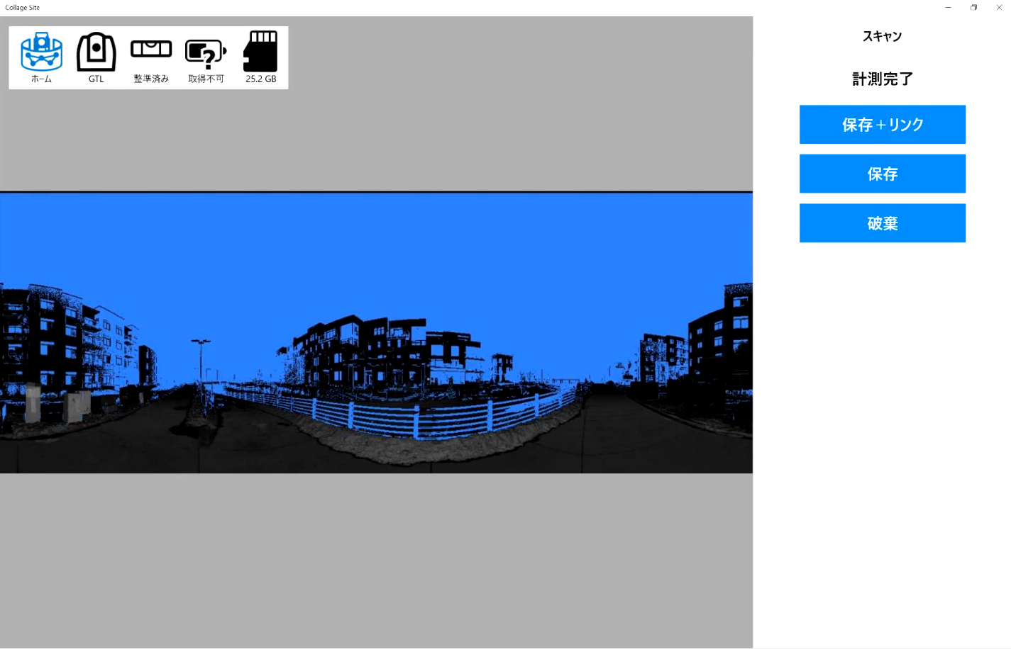 - 保存+リンクボタンをタップすると、スキャナ―からタブレットへデータ転送を開始します。さらに、データ転送が完了した後、現在のステーションと一つ前のステーションの間にリンクを自動的に作成し、点群マッチングを用いた自動初期調整によるレジストレーションを自動的に行います。