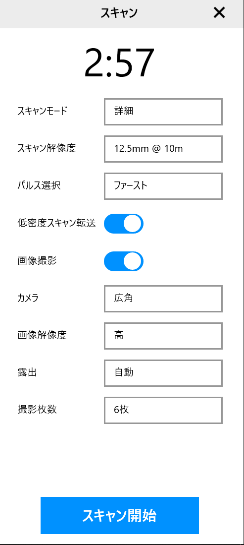 - 画像撮影: トプコン製スキャナーでは、点群の色付けのため、スキャンする前に画像を撮影します。レンズカバーが外されており、周囲が障害物や人などにより遮られていないことを確認してください。