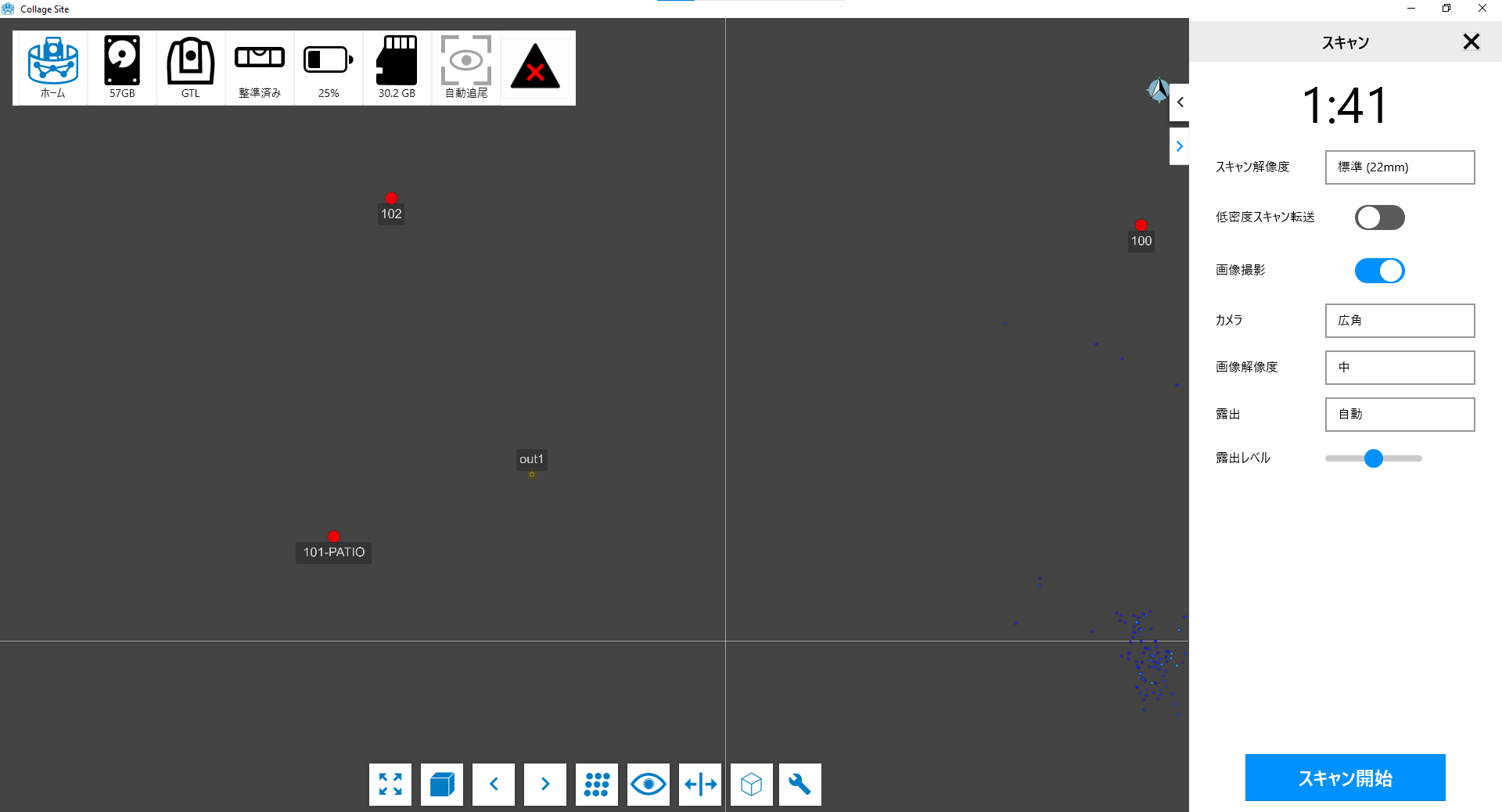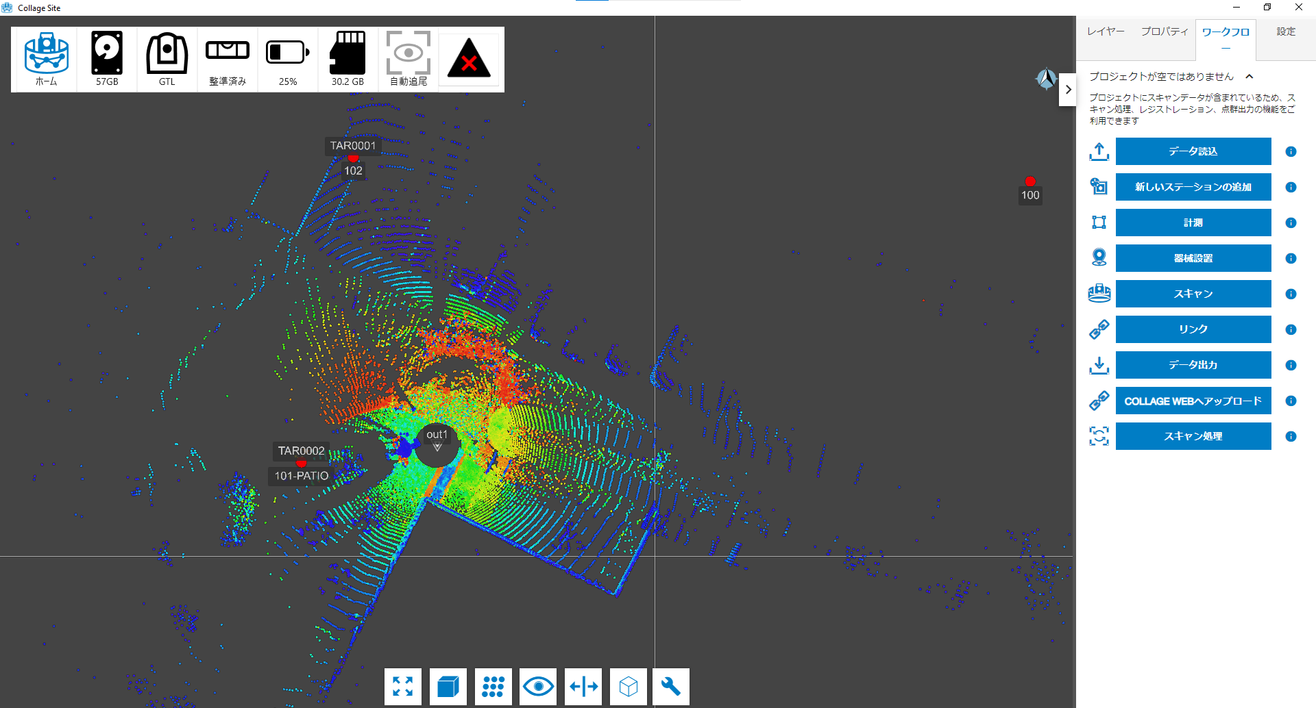 データ転送が完了すると、Collage Siteはスキャン処理が開始されます。ステーションデータとスキャンが処理されて後、ビュー上に点群が表示され、点群マッチングによるレジストレーションに使用できるようになります。