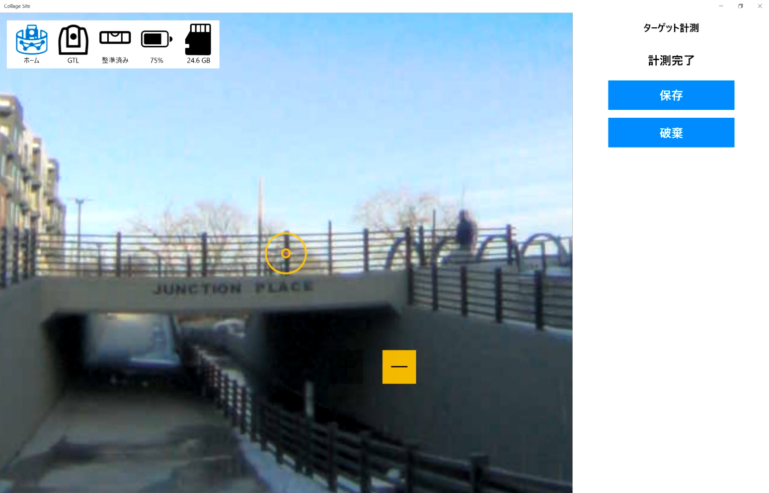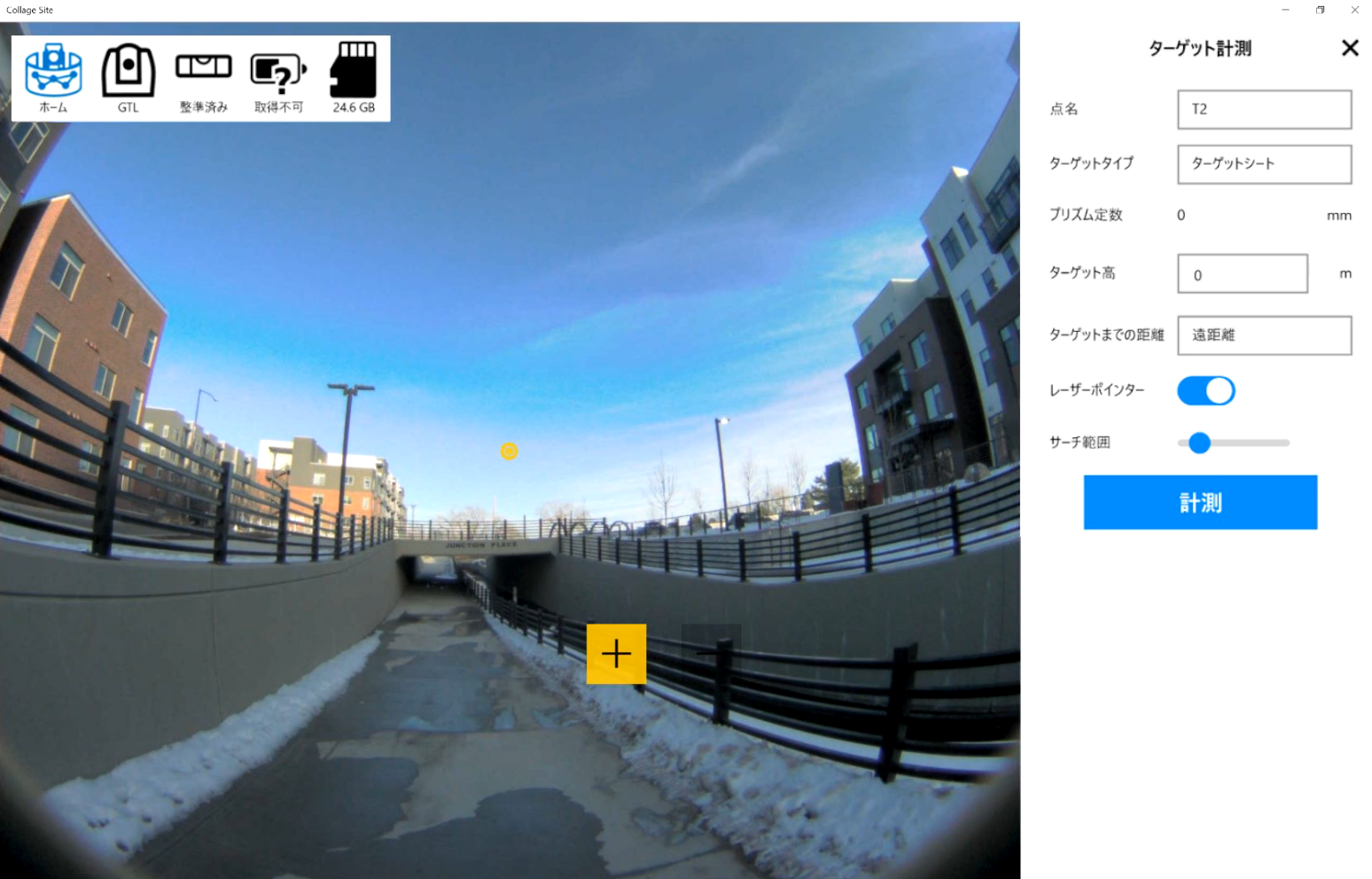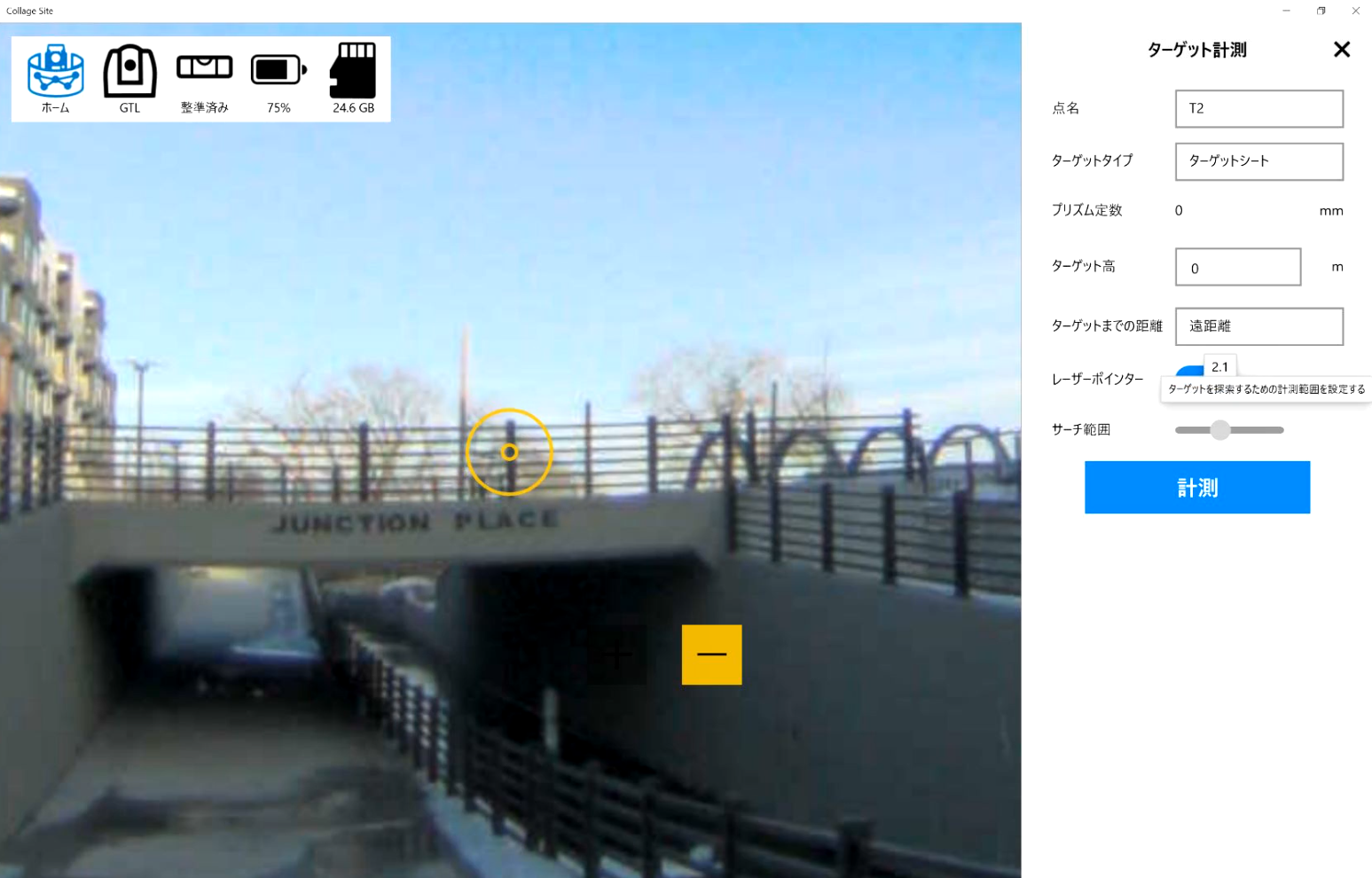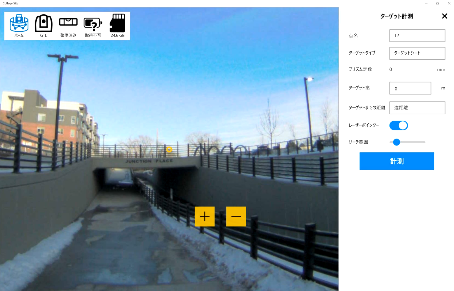 ターゲット計測画面は、器械点後視点法、後方交会法、一般的なターゲット計測や新点計測ワークフローにおいて使用されます。ターゲットを視準するためにカメラ画像をタップしてスキャナーを回転したり、黄色の + と - のボタンを使用してカメラ画像の拡大/縮小を行ったりできます。
