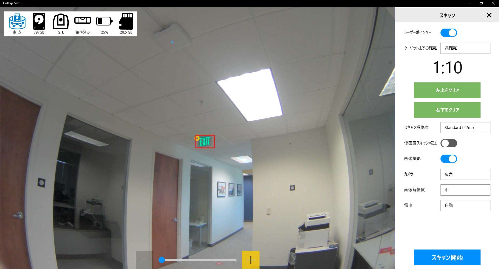 まず、スキャナーを回転させて、カメラ画像中心にあるレチクルがスキャンを行いたい矩形範囲の左上隅の位置を向くようにします。スキャナ―のレーザーポインターをオンにすると、スキャナ―の向きがわかりやすくなります。レーザーポインターを使用するには、右側ワークフローパネルの上部にある レーザーポインター トグルをオンにします。