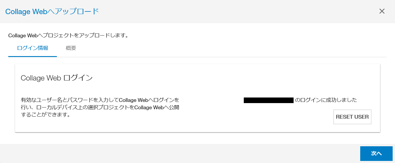 右側のワークフローパネルより、Collage Webへアップロードを選択します。