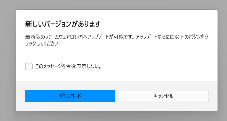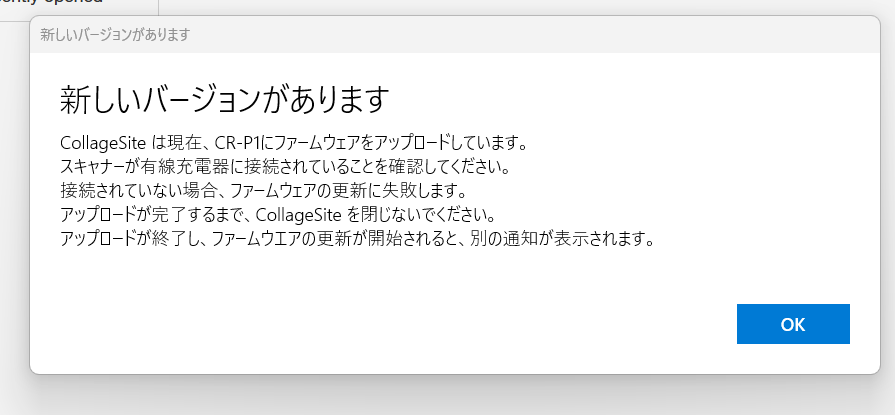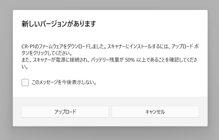 ダウンロードが完了したら、CR-P1 スキャナに再度接続すると、以下のメッセージが表示されます: