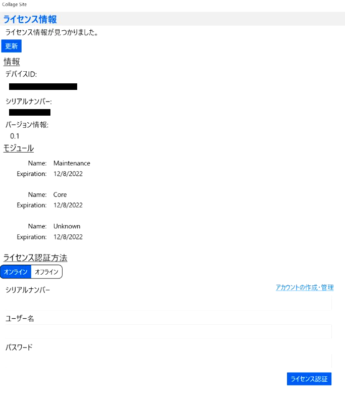Collage Siteのライセンス設定より、オンライン を選択します。