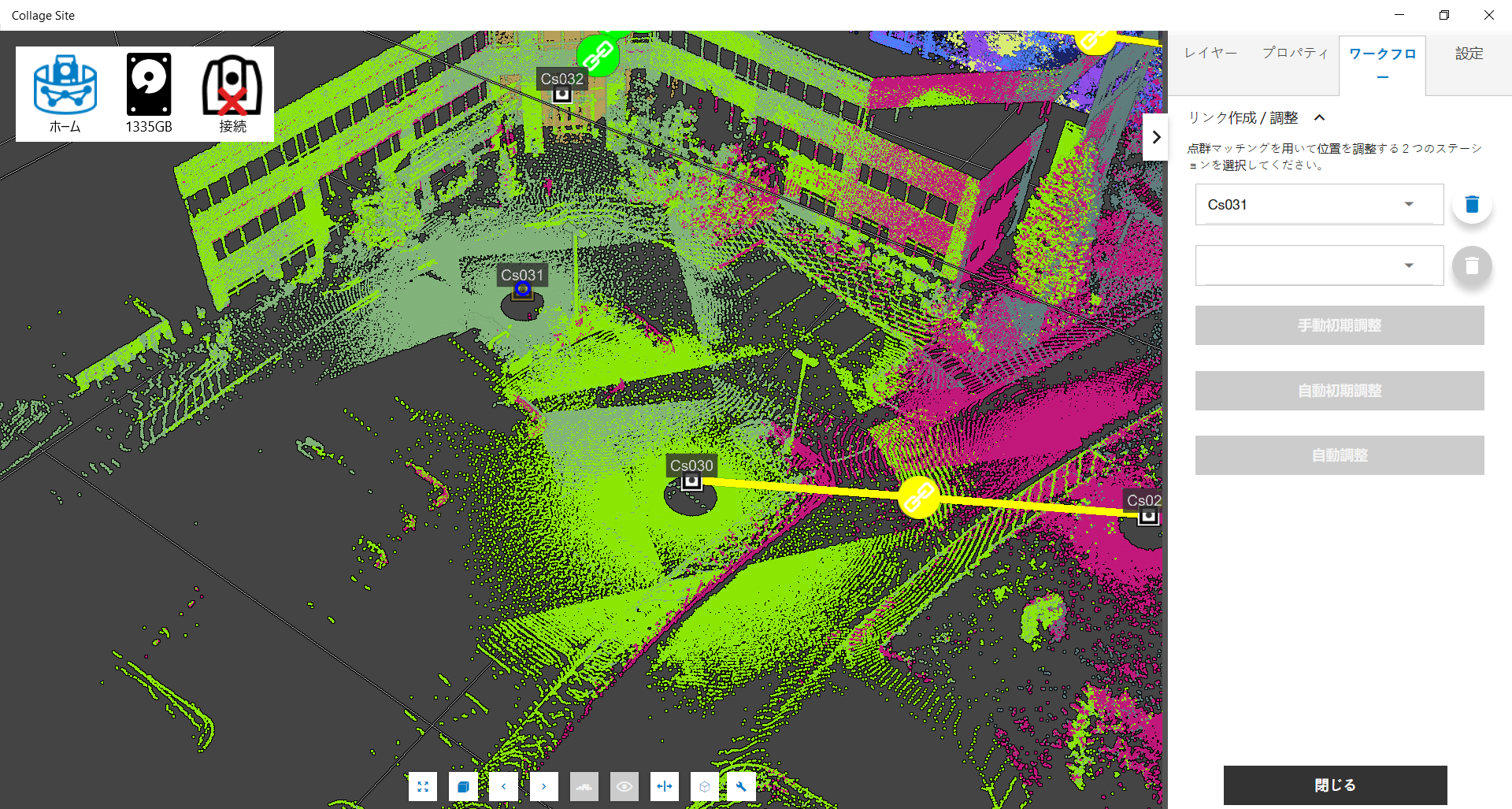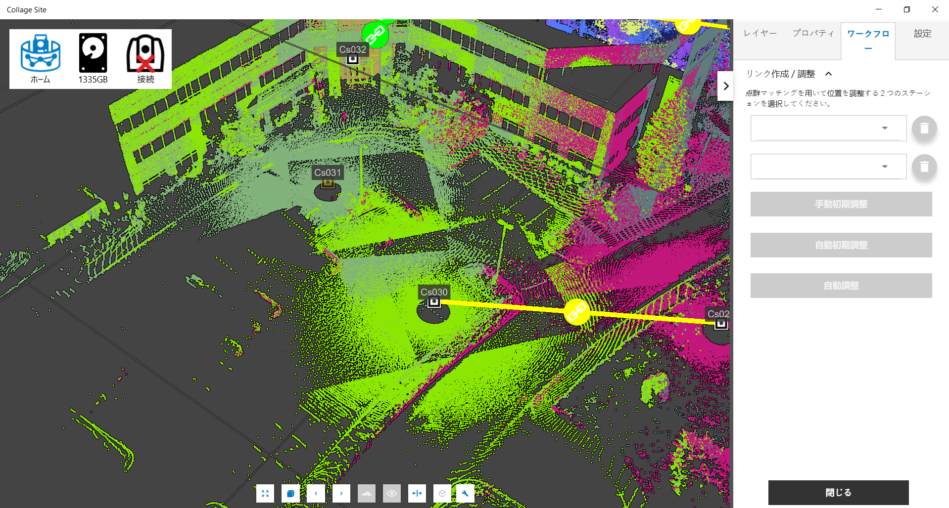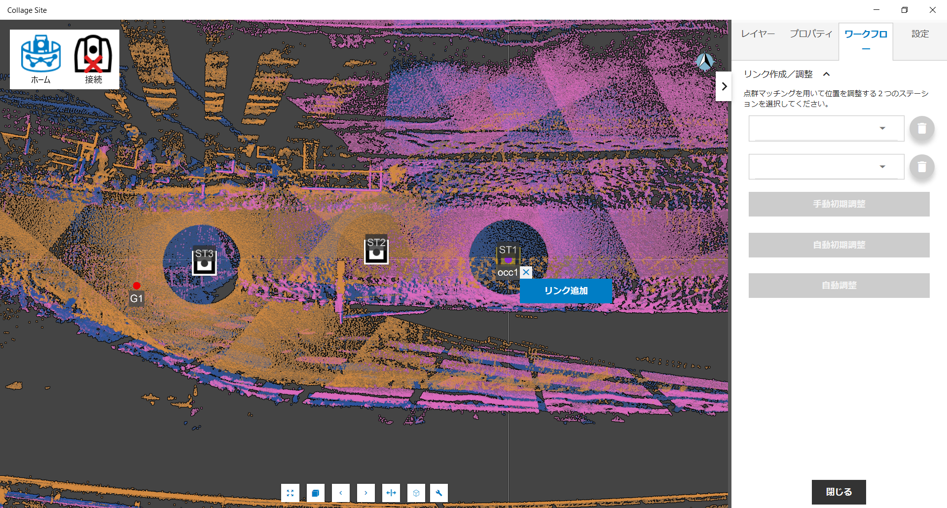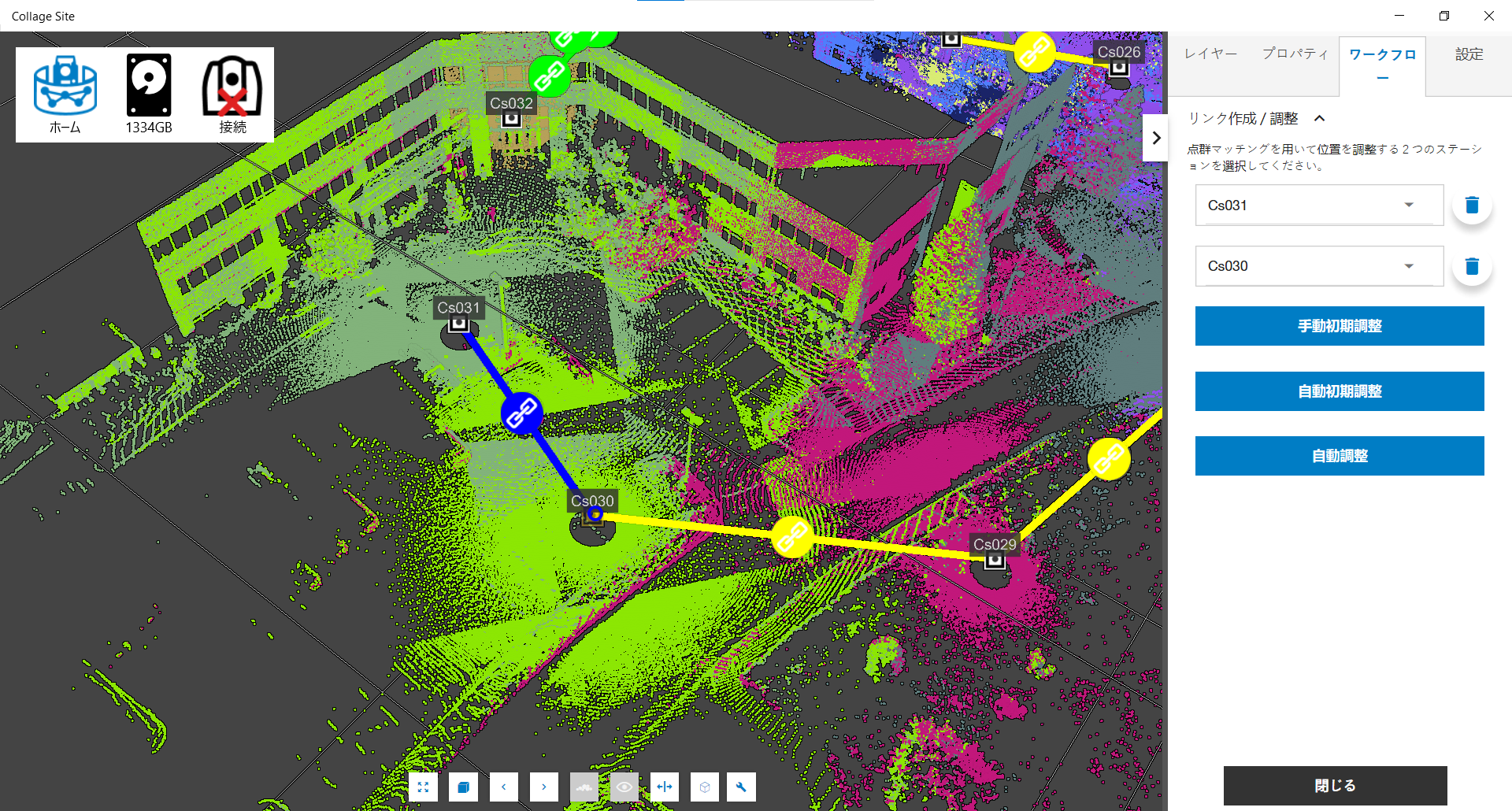 2つ目のステーションを追加すると、ビュー上にリンクのマークが表示され、点群マッチングを用いた調整機能が有効になります。これらのオプションから1つ選択し、2つのステーションを調整しレジストーレーションを行います。
