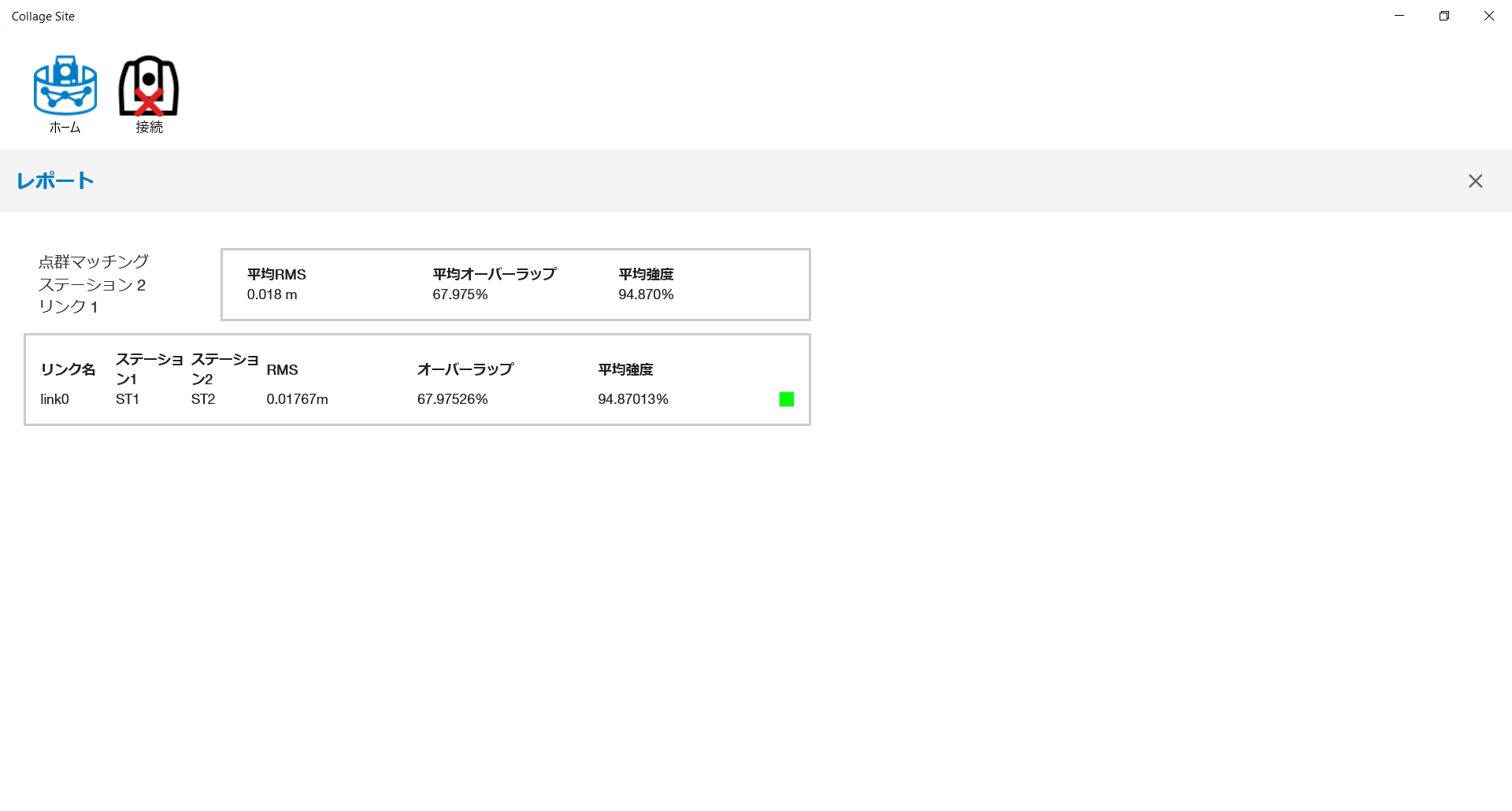 レジストレーションレポートは、レジストレーショングラフ内のすべてのリンクにおける点群マッチングの処理結果を指標で示し、各リンクのステーション間の自動調整の品質概要を示します。