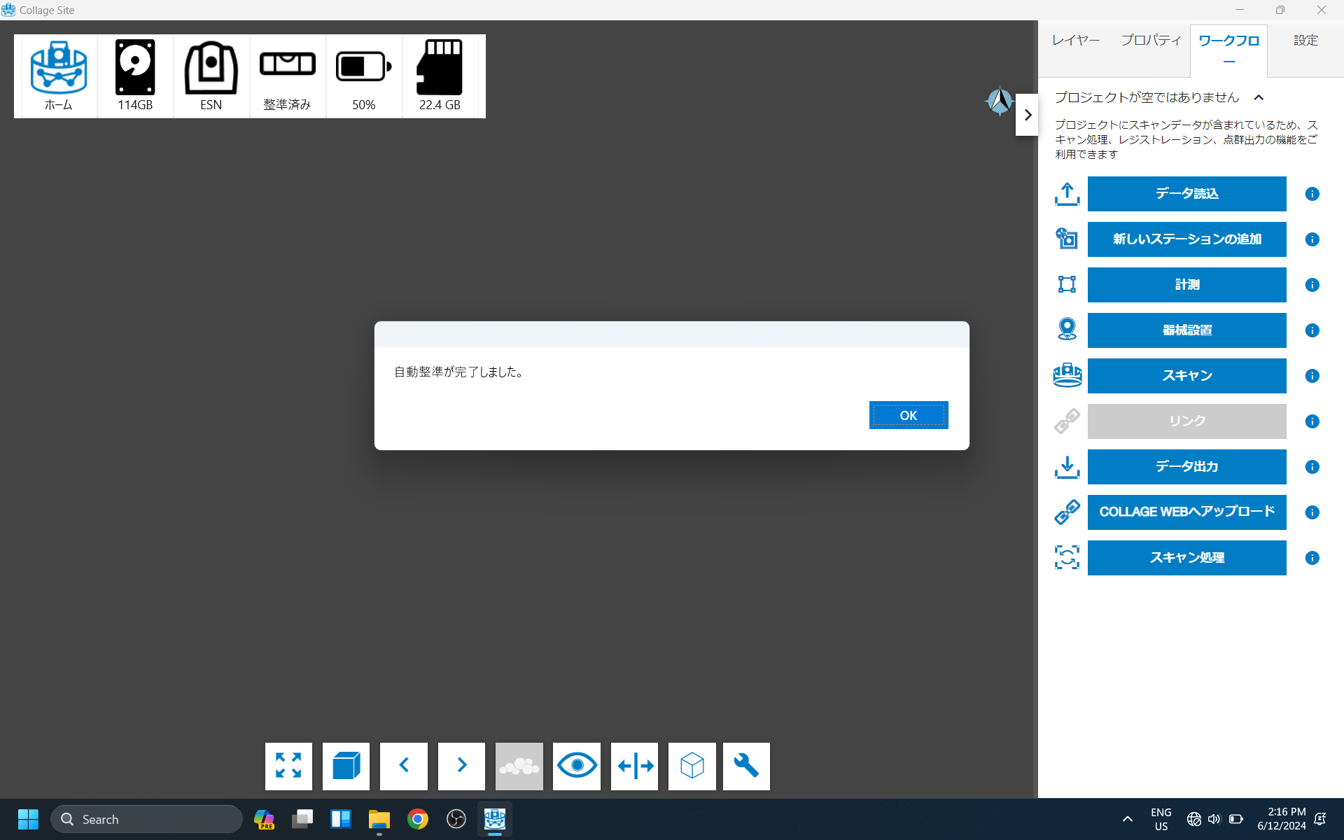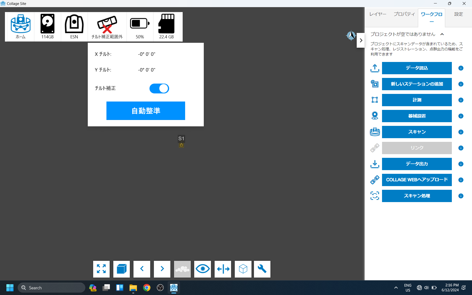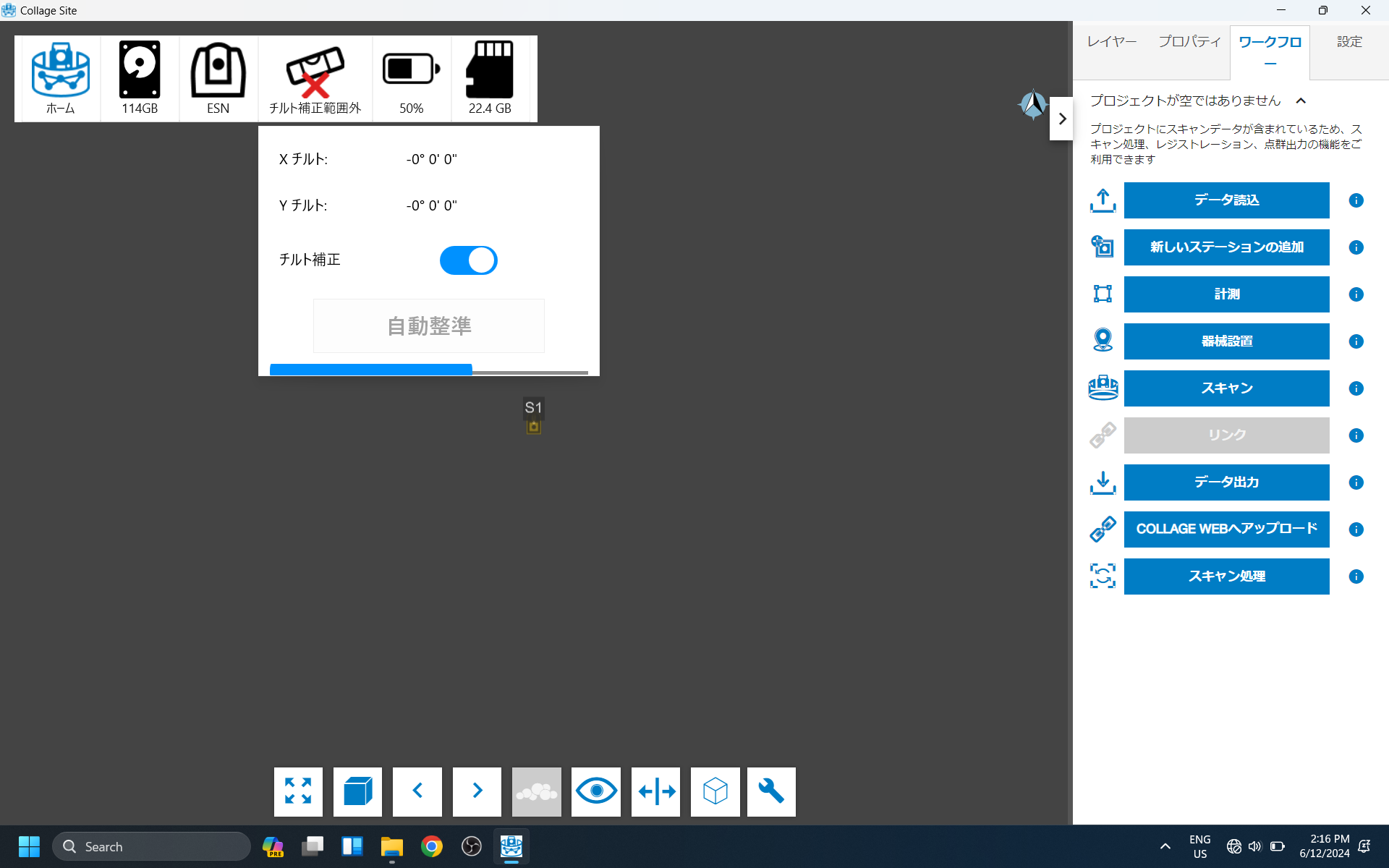 オートレベル機能は、ESN-100 スキャナを自動的に水平にします。 これを使用するには、チルトを有効にする必要があります。 まず、画面上部のチルトステータスボタンをタップします。
