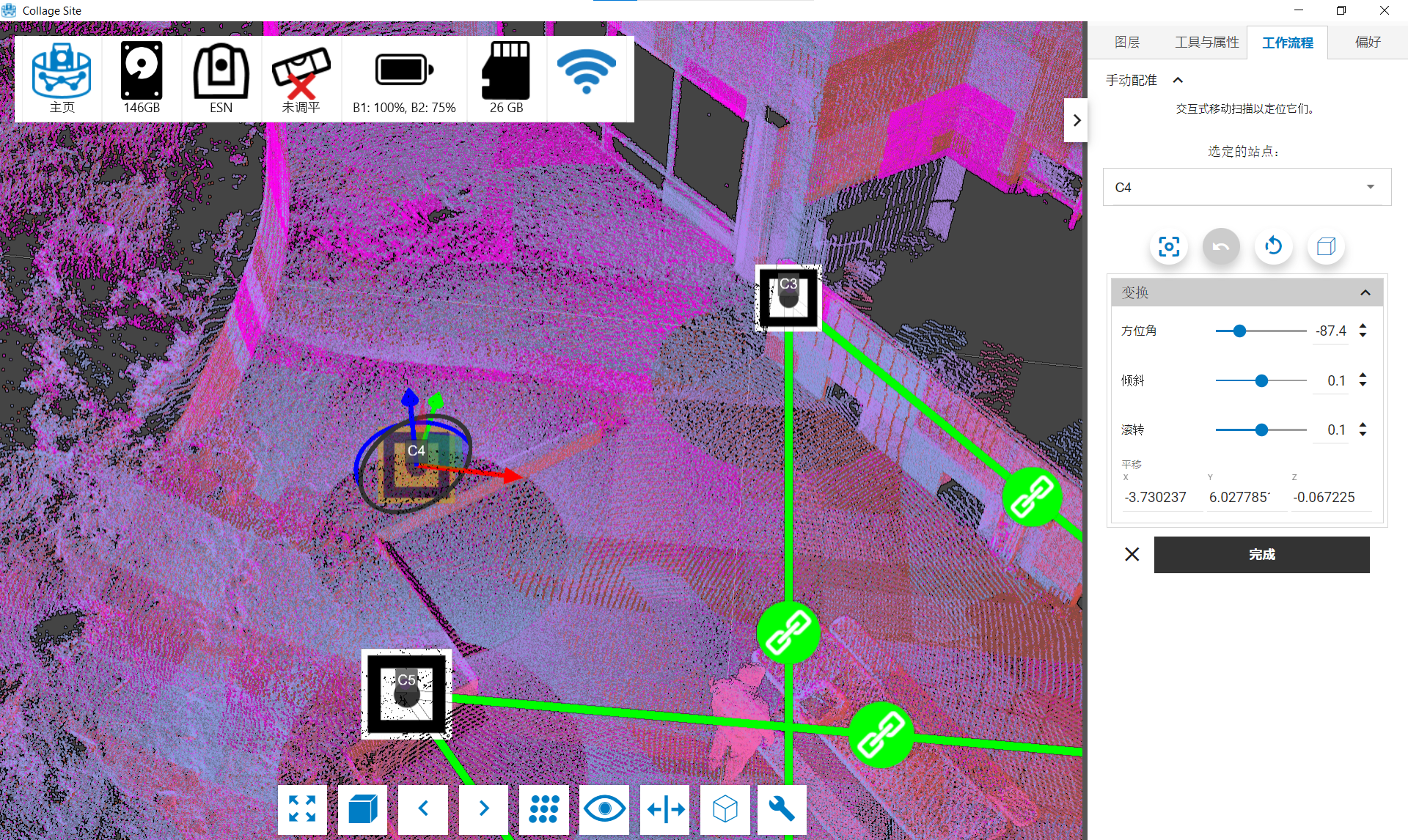一旦您对台站的大致对齐情况感到满意,就可以点击工作流程菜单中的完成按钮,保存您对项目中的台站、位置和方向应用的转换。