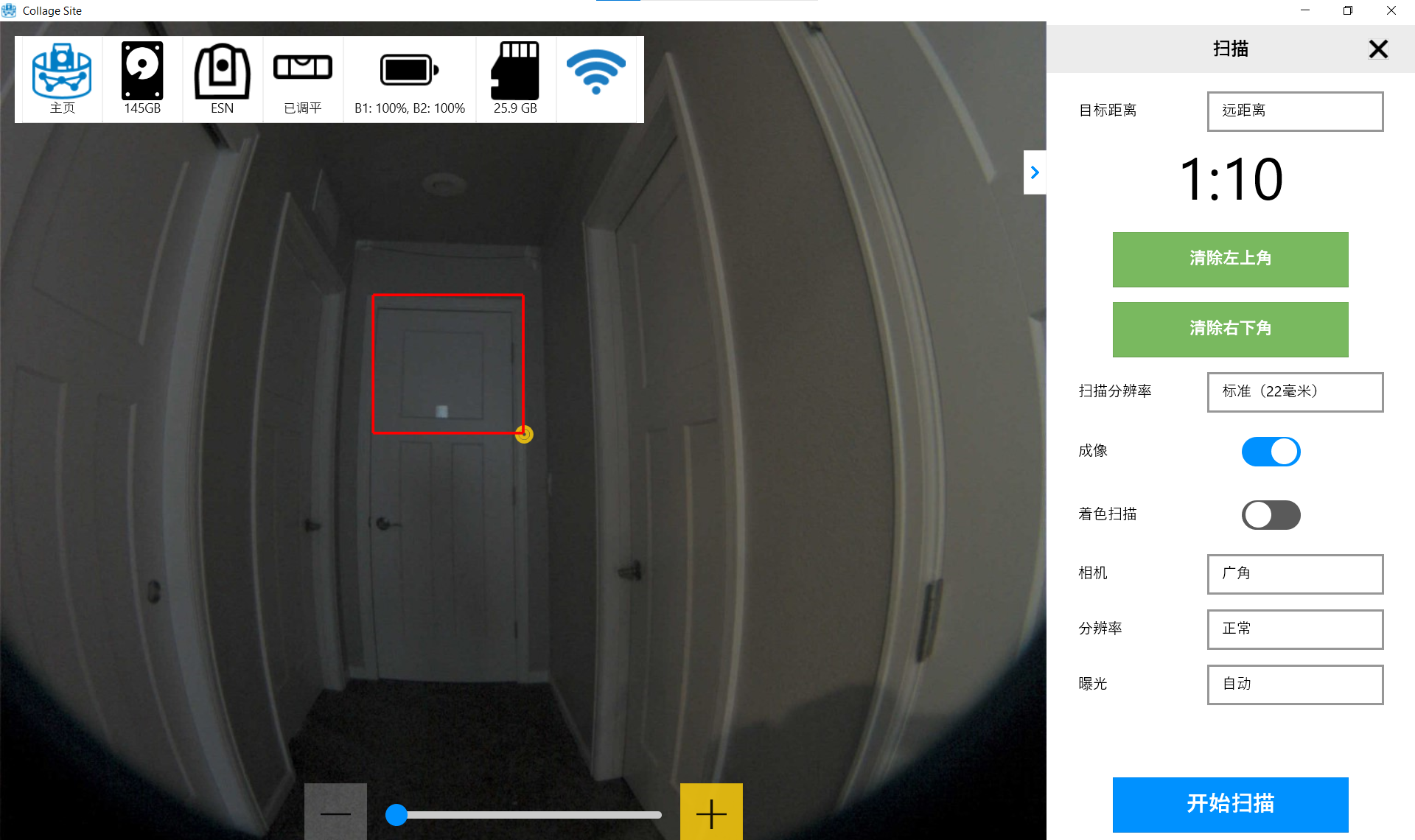 重要注意事项: 确保屏幕上的红框准确覆盖您需要扫描数据的区域,特别是在执行 180 度或更大扫描时。如果红框不准确或没有覆盖所需的整个区域,请清除边角并重新尝试设置参数。