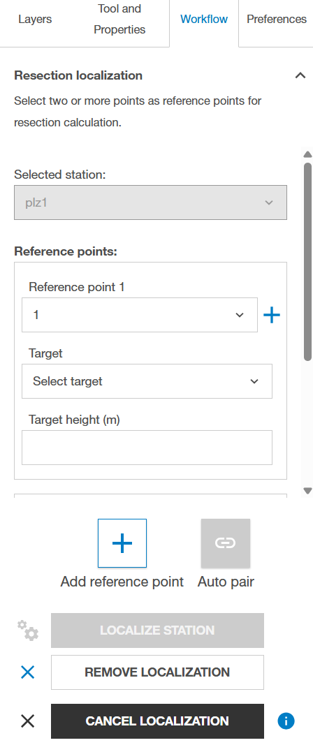 Next, set your desired Reference Points in the Resection panel - a minimum of 2 is required but you can use as many as you would like. After at least two Reference Points are set, the Auto pair button should light up and be selectable. Tap the button to run the Auto pair routine: