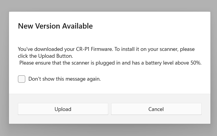 Once the download is completed, connect to your CR-P1 scanner again and you should see the following message: