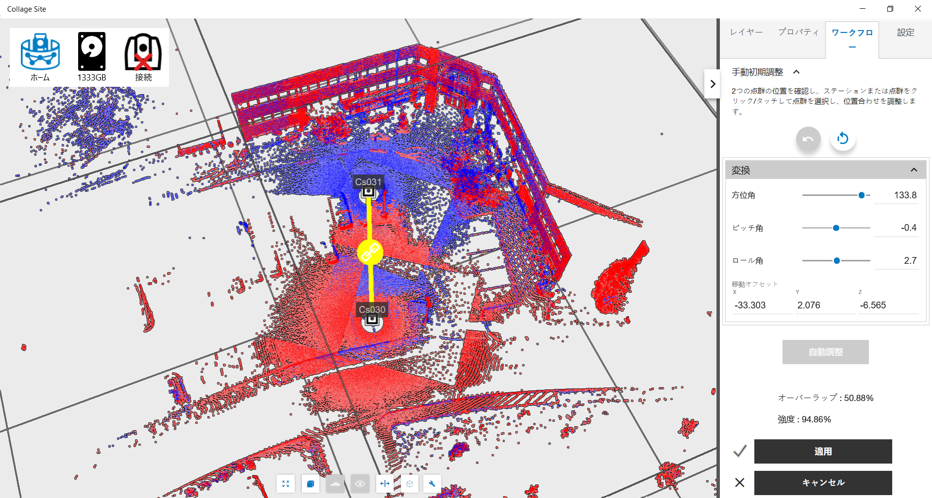 ステーションを大まかに調整したら、自動調整ボタンをタップして、手動調整したステーション位置に基づいて点群マッチング処理を実行できます。