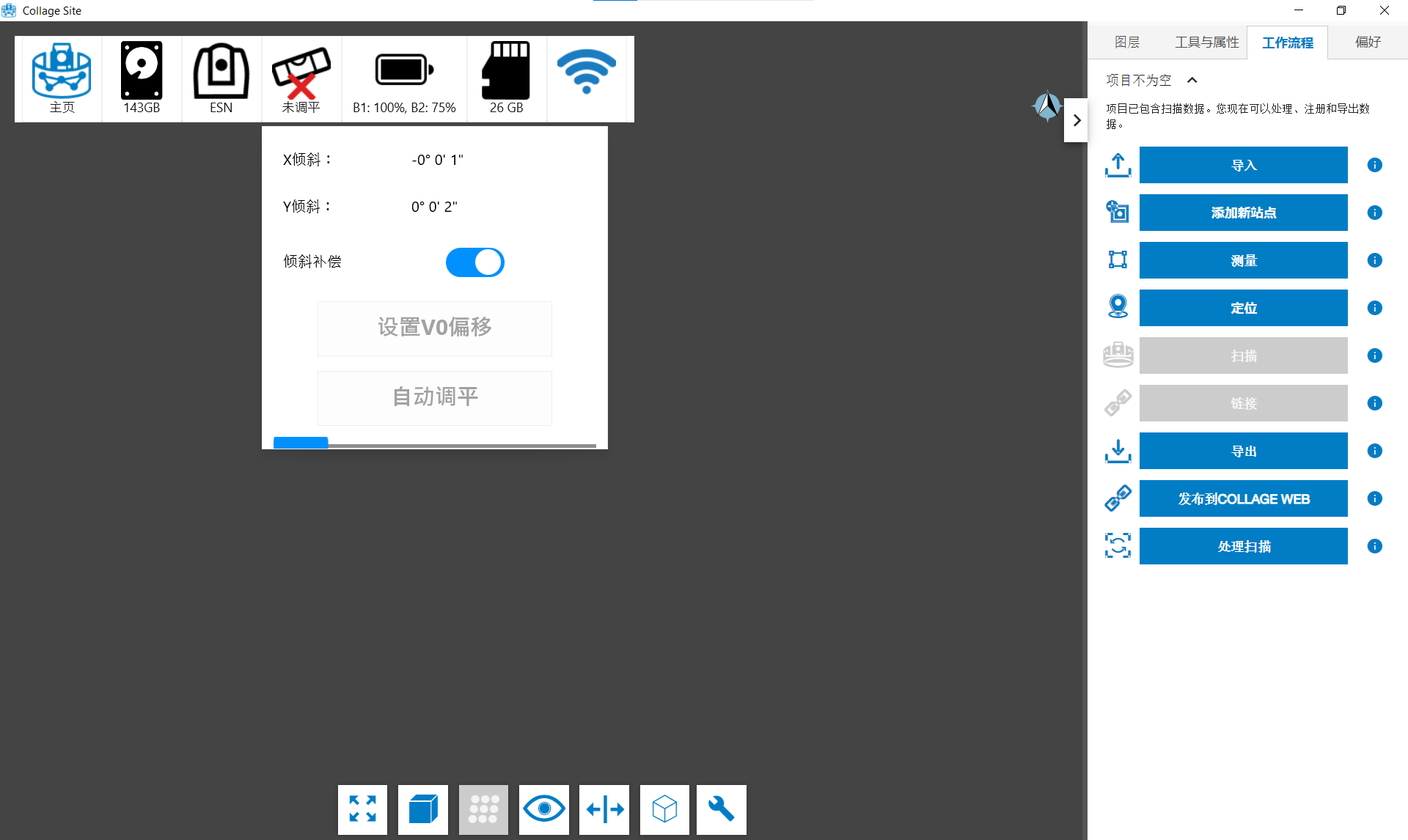 自动调平功能可自动调平ESN-100扫描仪。要使用该功能,必须启用倾斜功能。首先点击屏幕顶部的倾斜状态按钮。