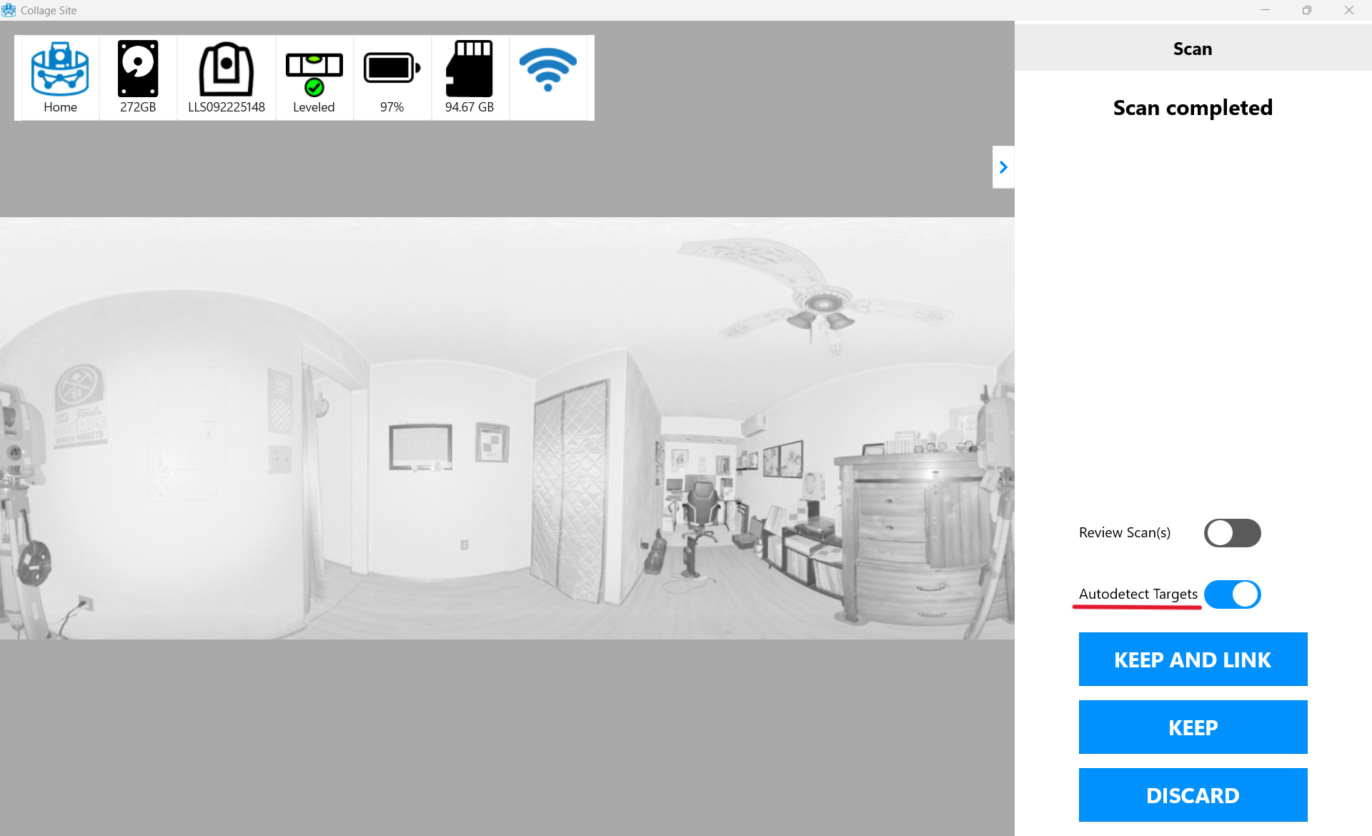- The Keep and Link button will initiate the transfer of the scan data from the instrument to the tablet. Additionally, Collage Site will automatically create a link between the current station and the previous station and register them using the automatic Cloud-to-Cloud registration option when Keep and Link is selected.