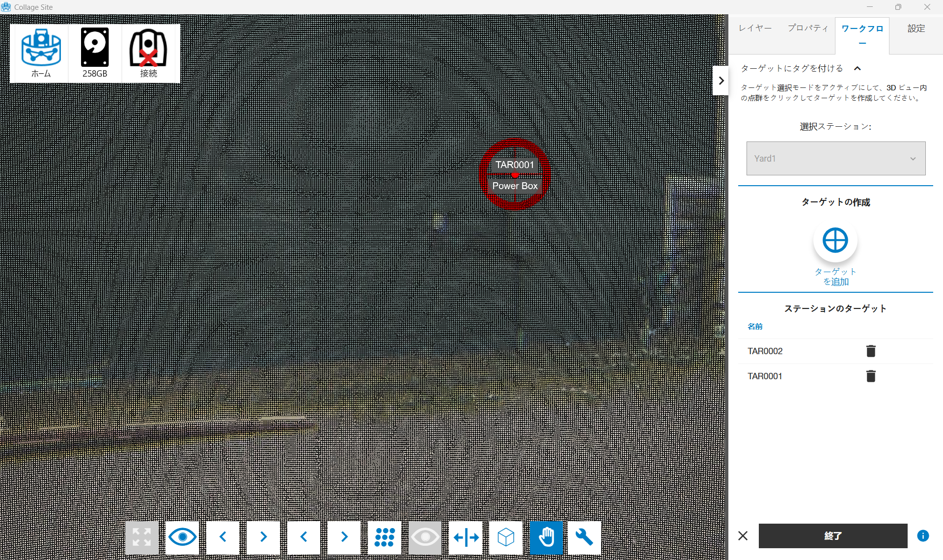 点群スキャンデータを利用して、コラージュサイトでターゲットを過去にさかのぼって作成できるようになりました。これは様々な面で大きな助けとなりますが、特にスキャナを使って現場にいる間にターゲットを撮影し忘れてしまった場合などに便利です。ワークフローを開始するには、ターゲットを 「表示 」してタグ付けしたいステーションを選択し、Localizeメニューに移動します。そのメニューの中にTag Targetsというボタンがあります。: