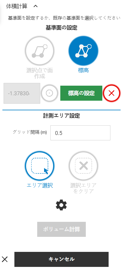 エリア選択が完了したら、体積計算ボタンをタップして分析を実行します。