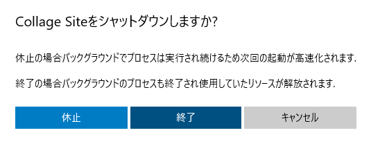休止 オプションは、素早くアプリケーションを終了します。また、バックグラウンドプロセスを実行状態のままにしているため、次回のCollage Siteの起動時間が短くなります。バックグラウンドで余分なハードウェアリソース (主にCPUとメモリー) が使用されていても問題が無い場合、または、すぐにCollage Siteを再び使用する場合に、このオプションを利用することを推奨します。