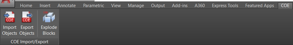 Now, you’ll need to open AutoCAD. Navigate to the COE plugin tab and click Import Objects, and the Import Options dialog will appear.