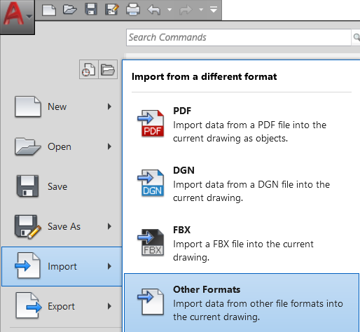 Within AutoCAD, click on the AutoCAD logo drop down in the top left-hand corner and select Import, then Other Formats.
