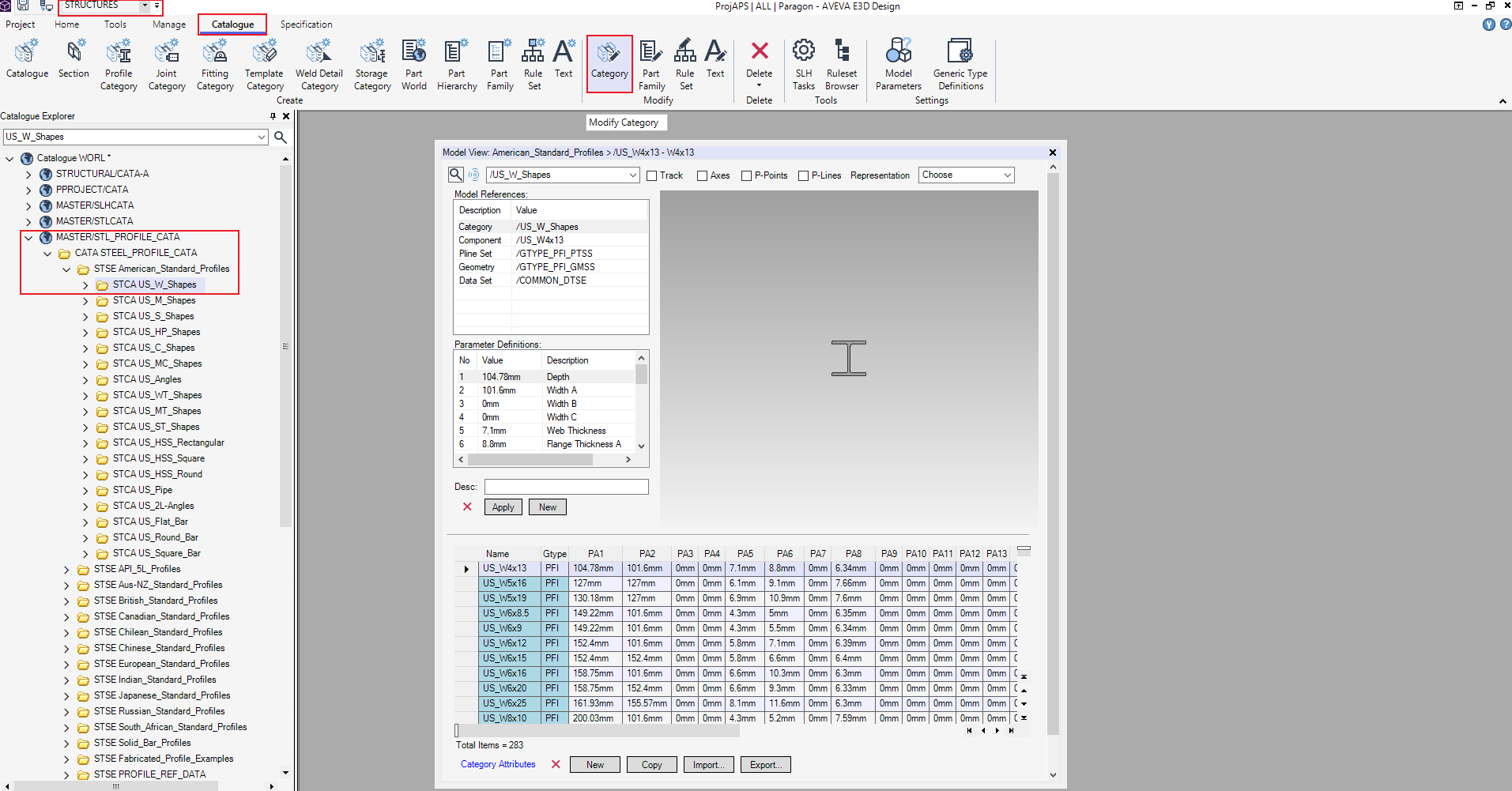 - In the Catalogue Explorer, expand the desired profile and select the STCA you want to export first (each STCA will need to be exported from E3D individually, but multiple STCAs can be combined into one standard in the EdgeWise import tool)