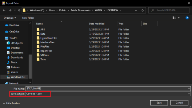 - In the resulting Export Data file explorer, choose a save location and a name for the file, then change the ‘Save as type’ to CSV File (*.csv)